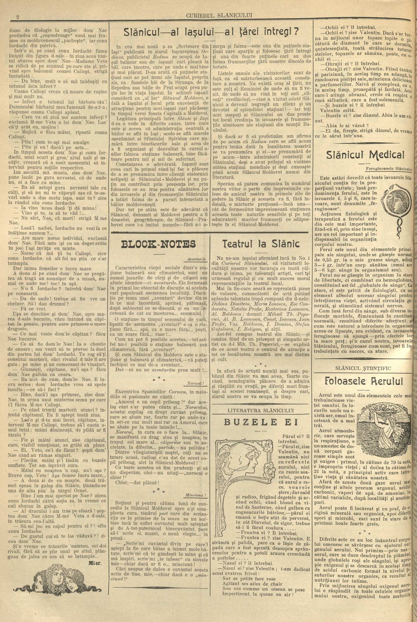 Din rubrica ,,Block-Notes” aflăm că o caracteristică a vieții sociale dintr-o stațiune balneară o constituie, nu doar jocurile de noroc, sau de căișori, sau altele identice, ci și ,,aventurile”, pentru că ele formează în primul rând, obiectul de discuție al acelora care populează asemenea localități: ,,Discuția pe tema unei `aventuri` devine din ce în ce mai încordată, aprinsă, pătimașă, după subiectul care se țese și ea nu încetează decât o dată cu încheierea sezonului. O stațiune pe timpul verii lipsită de asemenea `aventuri` este ca o stațiune fără… apă, ca o mare fără… pești, ca un soare fără… raze! Cum nu pot fi posibile acestea, tot astfel nu e posibilă o stațiune balneară sau climaterică, fără `aventuri`. Și cum Slănicul din Moldova este o stațiune și balneară și climaterică, vă puteți închipui ce de aventuri… Dar să nu ne aventurăm prea mult!”.