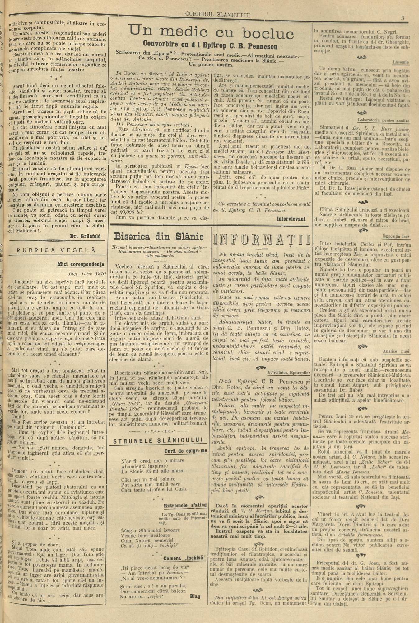 Prim-epitropul C. B. Pennescu este din nou ținta unor presupuse acuzații, drept pentru care a fost rugat să aducă o serie de lămuriri, de către redactorul-șef al ziarului (așa îl voi numi în continuare pe M. Miereanu, inițitorul, fondatorul și singurul redactor al ziarului, n. a.), întrucât cazul a fost prezentat în ziarul bucureștean ,,Epoca” (ziarul oficial al Partidului Conservator), în urmă cu o săptămână (miercuri, 14 iulie). Dar despre ce era vorba? Un medic din București, pe numele său, Andrei Antoniu, a adresat o plângere Administrației din Slănic, în care menționa că a fost `expulzat` din hotelul ,,Racoviță”, pentru că a încălcat dispozițiile acesteia. Iată însă ce a declarat dl Pennescu: ,,Este adevărat că am notificat dlui doctor să se mute din hotel, iar pentru că domnia-sa a refuzat, l-a mutat încasatorul băilor. Celelalte presupuse fapte invocate de acest tânăr cu obrajii pudrați, cu părul frizat în fiecare zi și cu jachete en queue de poisson (în coadă de pește), sunt minciuni. În scrisoarea publicată în `Epoca` are un spirit necuviicios; pentru aceasta l-aș scutura puțin, mă tem însă să nu-mi murdărească hainele cu pudra-i de pe obraz. Pentru ce l-am concediat din hotel? Înfrângea disopozițiile noastre. Motivele le va arăta avocatul nostru la proces, fiindcă dl doctor a introdus o acțiune prin care ne cere nici mai mul nici mai puțin, decât 20.000 de lei. Cum va justifica daunele și ce va câștiga se va vedea în fața instanțelor judecătorești”. Iar epitropul continuă, imperturbabil: ,,Are și mania persecuției numitul medic. Se plânge că l-am concediat din hotel pentru că făcea concurență medicilor noștri oficiali. Altă prostie, deoarece nu numai că nu ne poate face concurență, dar noi înșine am dorit să aducem aici, pe dr. Popovici din București, ca specialist de boli de gură, nas și urechi (medic ORL-ist, n. a.). Am vrut să-l numim oficial ca medic al băilor, dar n-a putut veni, după cum a arătat colegul meu, dr. Pușcariu, pentru că dispusese dinainte de întrebuințarea vacanței”. Dl Pennescu mai menționează că anul trecut au mai practicat în stațiune doi medici din țară, iar dl profesor doctor Gheorghe Marinescu (unul dintre marii savanți ai lumii, fondatorul Școlii Românești de Neurologie, n. a.) îi onorează aproape în fiecare an cu vizita în stațiune, unde oferă consultații ,,spre binele bolnavilor și cinstea acestei stațiuni balneare”. La finalul interviului, Pennescu a mai spus, oarecum sarcastic: ,,Atât cred că-i de ajuns pentru domnia-sa până la judecata procesului ce ni s-a intentat de domnul reprezentant al pilulelor Pink (denumire dată pentru pastilele roz ale dr. Wiliams, medicament brevetat de la sfârșitul secolului al XIX-lea până la începutul secolului al XX-lea, care pretindea că vindecă mai multe boli, printre care și ,,toate formele de slăbiciune la bărbați sau femei”, n. a.).