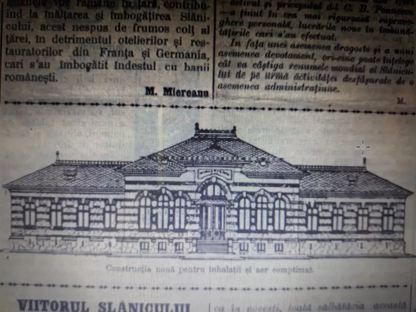 La rubrica ,,Anchetele noastre” ni se atrage atenția asupra unei informații în premieră, care dă și titlul articolului: ,,Noul stabiliment de inhalații”. Așadar, în urma incendiului de vara trecută (prezentat pe larg într-un episod anterior cât și separat, în cotidianul ,,Deșteptarea”), care printre altele a distrus și instalația de aer comprimat și inhalații a stațiunii, Epitropia Iași a luat măsuri urgente ca un nou stabiliment să fie construit și finalizat cât mai curând, astfel ca vizitatorii să nu ducă nicio lipsă în privința efecturării tratamentelor recomandate: ,,În scopul de a se clădi de astă-dată, un stabiliment de inhalații după ultimele cerințe, dl C. B. Pennescu, prim-efor a vizitat instalația similară din stațiunea Bad Reichenhall (Germania). Aici, în urma unor anchete și analize serioase, ca și a consultărilor cu celebritățile medicale și inginerești din străinătate – cum este inginerul mecanic Hossle, autorul stabilimentelor de inhalație de la Bad Reichenhall – Epitropia a stabilit modul de construcție a noului stabiliment de aer comprimat și inhalații din Slănicul Moldovei”. Din cauza iernii îndelungate, lucrările au început la 1 aprilie 1909, iar construcția va fi una din piatră, cărămidă și beton, iar mașinăriile mecanice vor fi instalate la subsol și parter. Aflăm că vor exista și cabine pentru o singură persoană; camerele de aer comprimat vor fi în număr de patru, dintre care una va fi pentru zece persoane, alta pentru șase persoane și două a câte două persoane, toate identice cu cele de la Bad Reichenhall: ,,Inhalațiile la gură și la nas se vor face după cele mai perfecționate sisteme, cum sunte cele ale doctorilor Bulling și Clar; de asemenea, inhalațiile prin pulverizație se fac în cabine tot cu aparatele acestor savanți. Subsolul este prevăzut cu patru motoare electrice, care pun în mișcare întreaga instalație a inhalatorului și stabilimentului de aer comprimat. Această nouă îmbunătățire adusă Slănicului din Moldova, datorită zelului dlor Pennescu, Pușcariu și Botez vor face într-adevăr ca această stațiune balneară și climaterică să devină una dintre primele stațiuni europene”.