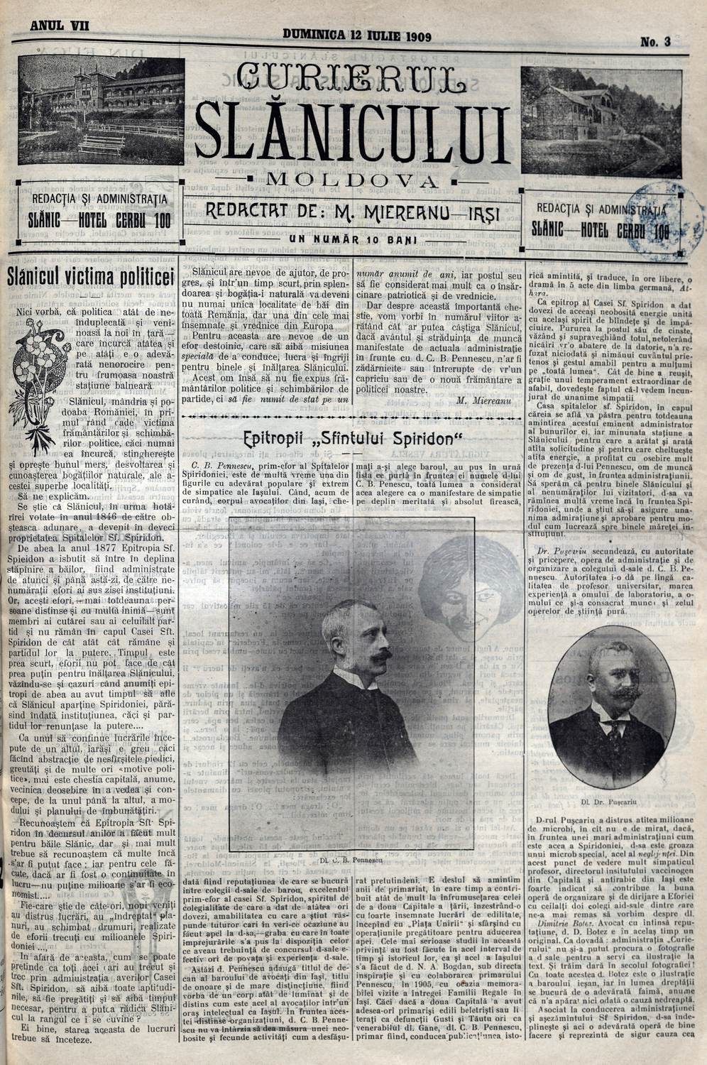 În ,,Epitropii Sfântului Spiridon” sunt evidențiate și actualizate profilurile celor aflați la conducerea Epitropiei: ,,C. B. Pennescu, prim-efor al Spitalelor Spiridoniei este de multă vreme una dintre figurile cu adevărat populare și extrem de simpatice ale Iașului. Când, acum de curând, Corpul Avocaților din Iași, chemați a-și alege baroul au pus în urnă lista ce purta în fruntea ei numele dlui Pennescu, toată lumea a considerat acea alegere ca o manifestare de simpatie pe deplin meritată și absolut firească, dată fiind reputația de care se bucură între colegii domniei-sale de barou – ca și în calitatea sa de prim-efor al Epitropiei, spiritul de colegialitate de care a dat dovadă în atâtea rânduri, amabilitatea cu care a știut să răspundă tuturor celor care l-au apelat în diverse ocazii, graba cu care în toate împrejurările s-a pus la dispoziția celor ce aveau trebuință de concursul său efectiv sau de povața experienței sale. Astăzi, dl Pennescu adaugă titlul de decan al Baroului de Avocați din Iași, titlu de mare onoare și de mare distincție, fiind vorba de un corp atât de luminat și de distins, cum este cel al avocaților, într-un oraș intelectual ca Iașul”. Sunt evocate mai apoi realizările din timpul primariatului său și ale perioadei de când se află în fruntea Epitropiei, unde lucrează ,,spre binele măreției instituției și a stațiunii Băile Slănic”. Nu în ultimul rând, frumoase cuvinte de apreciere sunt adresate și celorlalți doi epitropi care îl secondează cu brio pe C. B. Pennescu: dr. Emil Pușcariu, ,,care în lupta sa cu microbii este groaza unui microb special, cel al neglijenței” și Dimitrie Botez, ,,avocat de o mare reputație și care, alături de domnii Pennescu și Pușcariu completează lista generoasă a epitropilor actuali și depune un zel neobosit în îndeplinirea misiunii sale”.