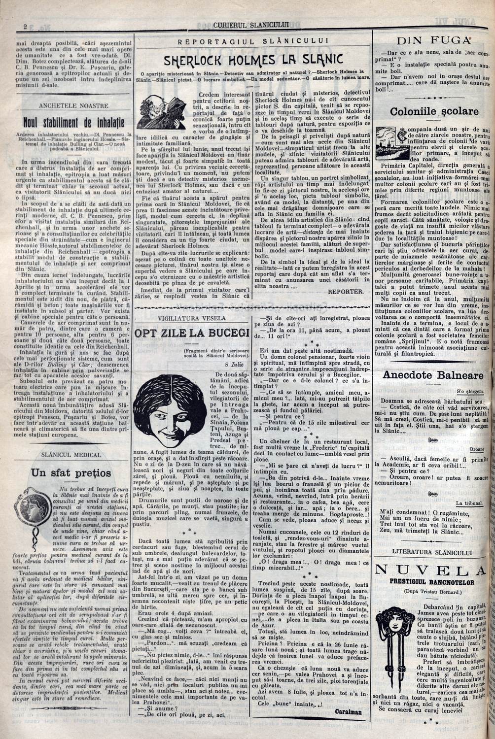 La rubrica ,,Reportajul Slănicului”, avem de-a face cu o ,,întâmplare idilică cu caracter de gingășie și intimitate familială”, într-un articol cu un titlu senzaționalist: ,,Sherlock Holmes la Slănic”. De fapt, este vorba de apariția în stațiune a unui tânăr plăcut ca înfățișare, dar ciudat, cu ,,privirea veșnic cercetătoare”, așa că, ,,privindu-l un moment, nu putem ști dacă e un detectiv misterios asemenea lui Sherlock Holmes, sau dacă e un entuziast amator al naturii”. Până la urmă, misterul a fost deslușit: ,,Așezat pe o colină, cu toate uneltele necesare picturii, tânărul nostru își alesese o superbă vedere a Slănicului, pe care începu să o eternizeze cu o măiestrie artistică deosebită, pe pânza de pe cavaletă (un suport gen șevalet, n. a.). Imediat se răspândi vestea că tânărul ciudat și misterios, detectivul Sherlock Holmes, nu-i decât un cunoscut pictor din Capitală venit în stațiune să realizeze câteva tablouri, pentru o expoziție pe care o va deschide la toamnă. Pictorul trecu apoi la modele, unul dintre ele fiind o drăgălață domnișoară care se afla cu familia la Slănic și pe care o imortaliza de la o anumită distanță: ,,De aici și idila artistică: când tabloul fu terminat complet – o adevărată lucrare de artă – distanța de mai înainte dispărea și pictorul nostru apărea zilnic în mijlocul acestei familii, alături de superbul model care-i inspirase tabloul simbolic. De al simbol la ideal și de la ideal la realitate – iată ce putem înregistra în acest reportaj, care după cum am aflat s-a terminat cu anunțarea unei căsătorii în elita noastră”.