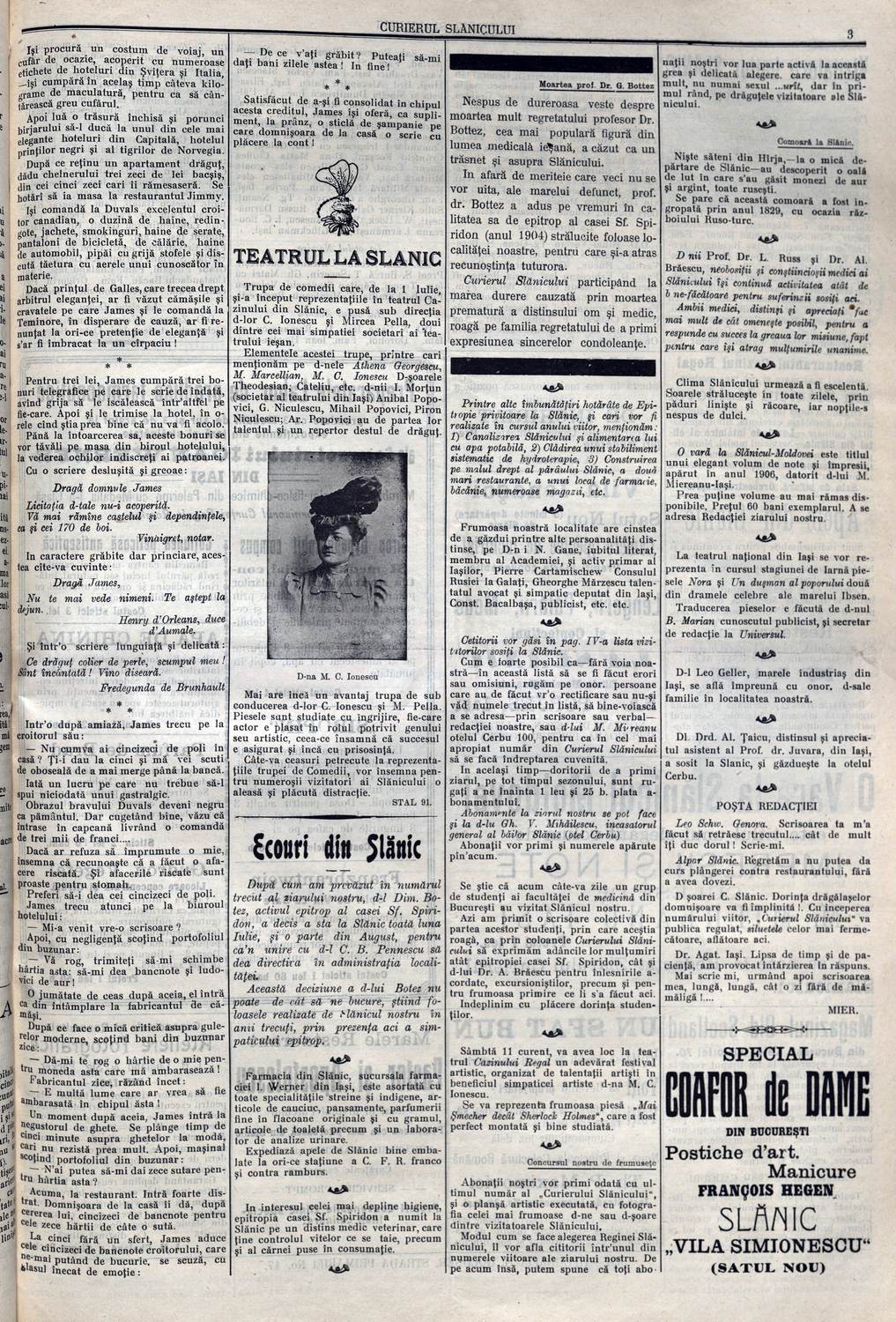Contiuăm prezentarea serialului dedicat ziarului ,,Curierul Slănicului Moldova” (din colecția Bibliotecii Centrale Universitare ,,Mihai Eminescu” din Iași – BCU), primul din România care a oglindit viața unei stațiuni balneare.