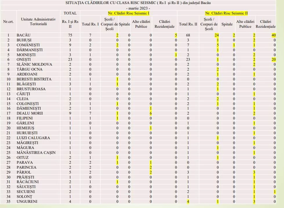Din cele 172 de clădiri expertizate, 75 se află în municipiul Bacău, unde 5 blocuri și 2 școli sunt încadrate la Rs I și 40 de blocuri și 24 de școli prezintă Rs II. Prefectul a notificat atât primăriile, cât și Inspectoratul Școlar Județean cu privire la oportunitatea de accesare a fondurilor pentru consolidarea școlilor cu Rs I prin Programul Național de Investiții „Școli sigure și sănătoase”, aprobat de Guvernul României prin OUG nr. 7/2023.