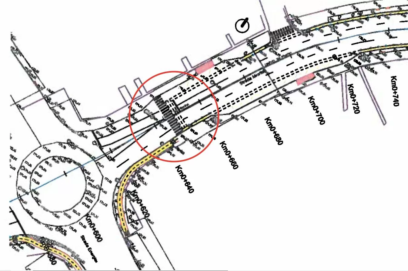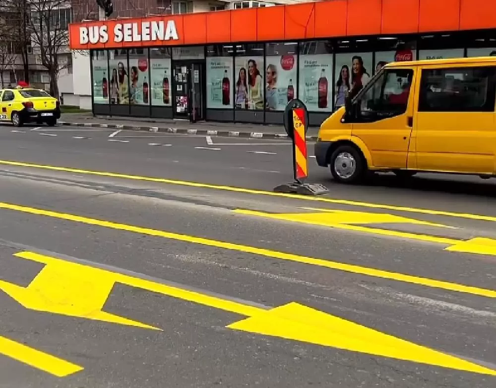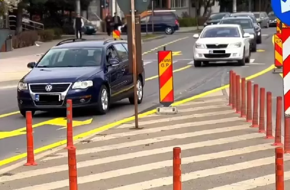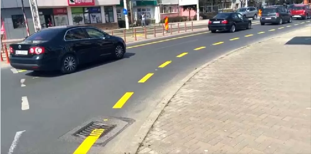 Pentru a se retrasa benzile pe sensul de mers spre sensul giratoriu, pe celălalt sens a mai răms doar o banda si jumătate.