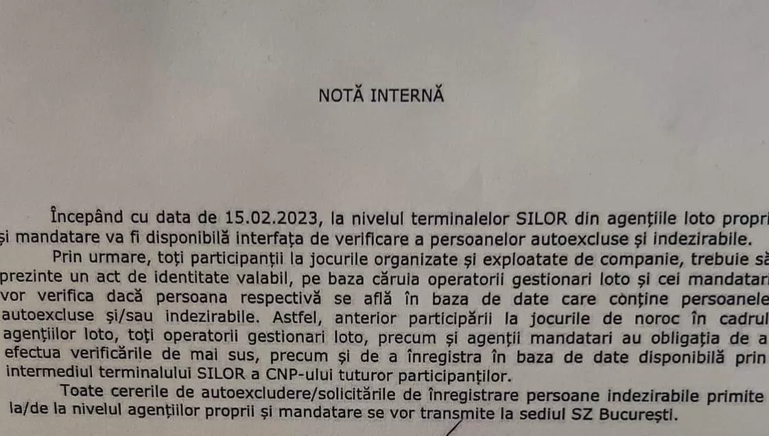 Din această lună, cei care ajung la agențiile loto pentru a cumpăra un bilet la jocurile organizate de stat sunt obligați să prezinte un document prin care să se identifice. Cerința a fost impusă tuturor organizatorilor de jocuri de noroc, cu scopul de a combate dependența în rândul românilor.