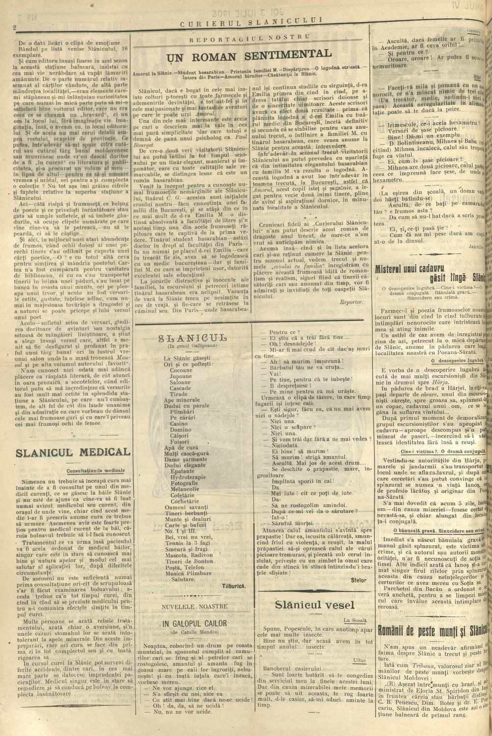 Iată însă că Slănicul nu e bogat doar în colțuri pitorești și izvoare tămăduitoare, ci și în ,,cele mai pasionate și mai fantastice aventuri pe care le poate urzi Amorul, acest copil isteț și șăgalnic”. Astfel, la rubrica ,,Reportajul nostru” este publicată povestea amoroasă dintre doi tineri, un basarabean școlit la Paris (C. G.) și o domnișoară din București, absolventă de filologie (Emilia M.). Aceștia s-au cunoscut la Slănic, iar dragostea care s-a înfiripat între cei doi a fost atât de puternică, încât Emilia a renunțat la logodna plănuită cu un tânăr medic din București și s-a logodit cu C. G. În timpul sezonului din 1908 cei doi iubăreți și-au rezervat cameră la Slănic, acolo unde destinul i-a unit, iar reporterul nu a mai făcut decât să înregistreze cu plăcere ,,această frumoasă idilă de romantism și realism, sigur fiind că tinerii căsătoriți care au avansat în timp vor fi admirați și invidiați de toți oaspeții Slănicului”.