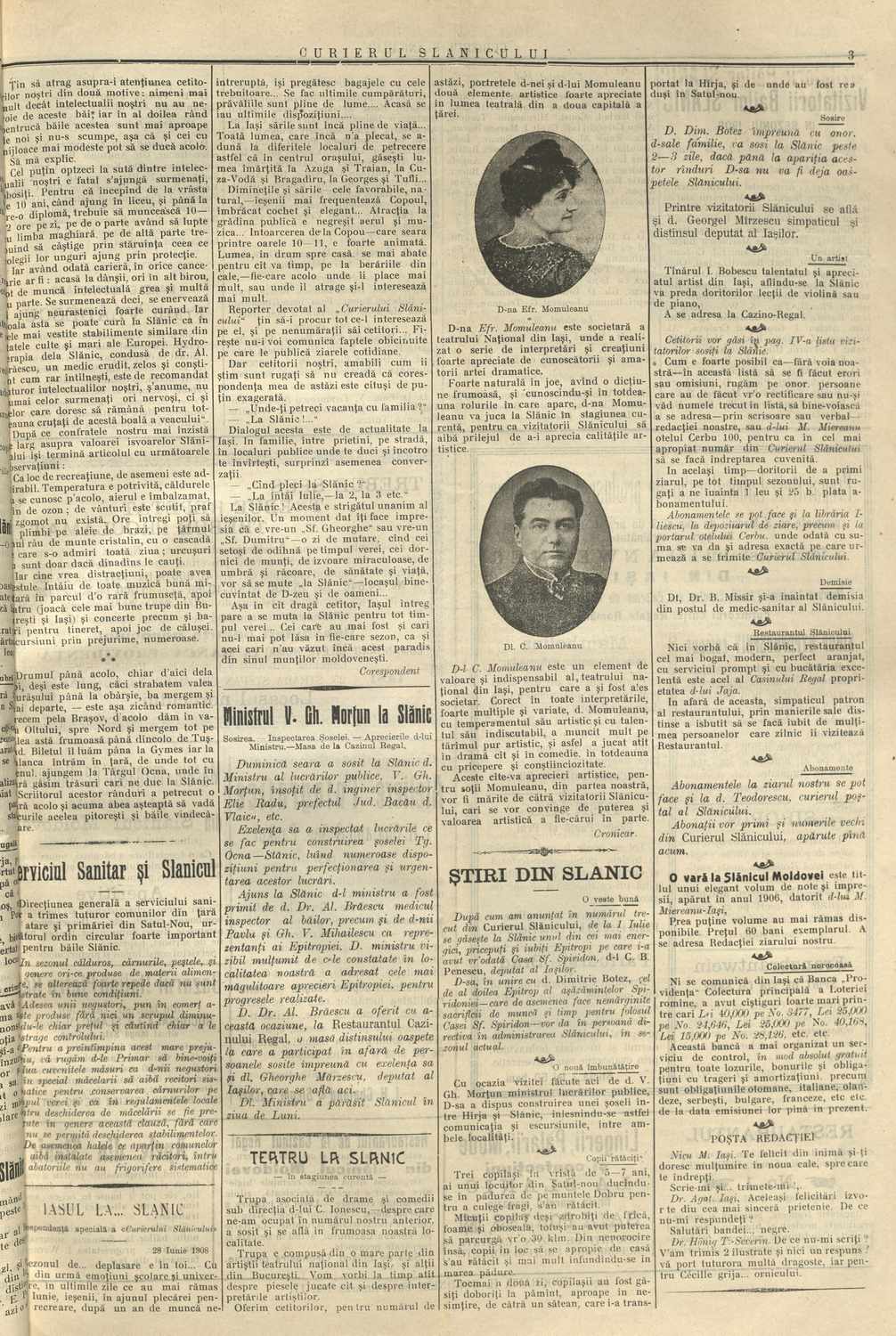 La rubrica ,,Teatrul la Slănic” sunt creionate portretele doamnei și domnului Momuleanu, actori de prim rang ai Teatrului Național din Iași: ,,Doamna Eufrosina Momuleanu a realizat o serie de interpretări și creații foarte apreciate de cunoscătorii și amatorii artei dramatice. Foarte naturală în joc, cu o dicție frumoasă și cu o bună cunoaștere a rolurilor în care apare, dna Momuleanu va juca la Slănic în stagiunea curentă, pentru ca vizitatorii Slănicului să aibă prilejul de a-i aprecia calitățile artistice. Domnul Constantin Momuleanu este un element de valoare și indispensabil trupei ieșene, pentru care a și fost ales ca societar. Corect în toate interpretările, foarte multe și variate, dl Momuleanu, cu temperamentul său artistic și cu talentul său indiscutabil, a muncit mult pe tărâmul artistic și astfel a jucat atât în dramă cât și în comedie, întotdeauna cu pricepere și conștiinciozitate. Aceste câteva aprecieri artistice pentru soții Momuleanu, din partea noastră, vor fi mărite de către vizitatorii Slănicului, care se vor convinge de puterea și valoarea artistică a fiecăruia în parte”.
