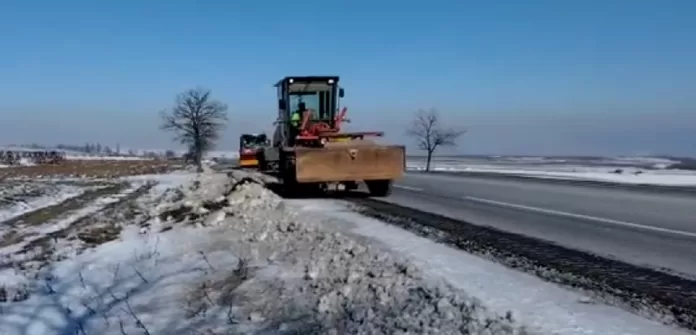 Intervenții pentru curățarea acostamentului consolidat pe DN 2, Gh. Doja, județul Bacău, în urma ninsorilor viscolite. Circulați cu atenție!