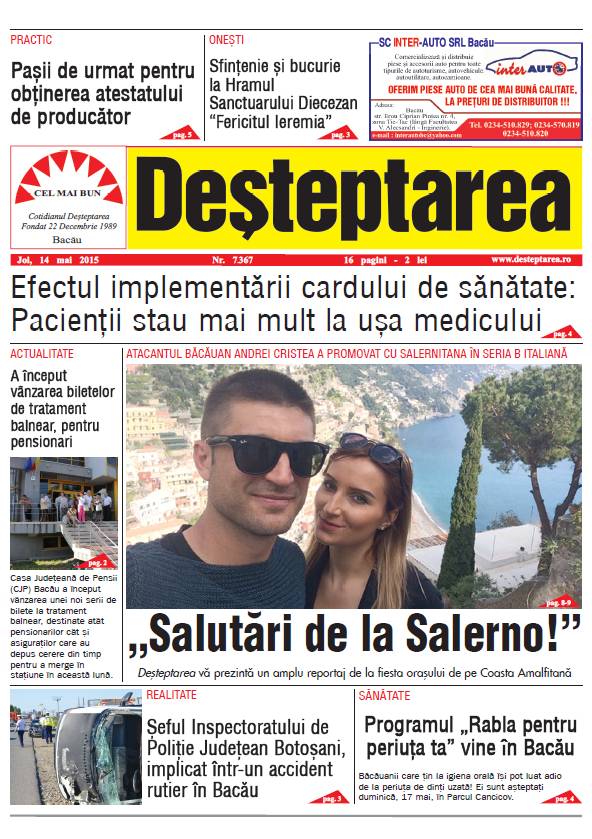 Pagina 1 Deșteptarea 13 mai 2015 Acțiune FacebookTwitterWhatsAppTelegramVK Acțiune FacebookTwitterWhatsAppTelegramVK Fotbal/ Liga 2: FC Bacău, victorie pe terenul Politehnicii Iași Atletism/ Campionatul Național Indoor: Raul Filimon (SCM Bacău), aruncare de Mondiale! Ansamblul Folcloric „Carpatica”, moment de excepție la Românii au talent BACĂU: Activități preventive dedicate Zilei Internaționale a Nonviolenței în Școli Moda ca fapt cotidian în Bacăul de acum 60 de ani Modernizarea DJ 252B Gioseni–Pâncești: CJ Bacău a aprobat indicatorii actualizați Acolo unde fiecare minut contează: Secția de Neurologie a Spitalului Județean de Urgență Bacău Biserica „Sfinții Trei Ierarhi” din Bacău și-a sărbătorit hramul prin Liturghie arhierească și momente de aleasă trăire duhovnicească 30 ianuarie – Ziua Internațională a Nonviolenței în Școli Tânără de 20 de ani din Comănești, atacată de un șofer care s-a oferit să o ducă acasă Acțiune a jandarmilor băcăuani la Comănești și Moinești pentru prevenirea absenteismului școlar Identificați și reținuți după ce ar fi alimentat cu carburant și ar fi plecat fără să plătească