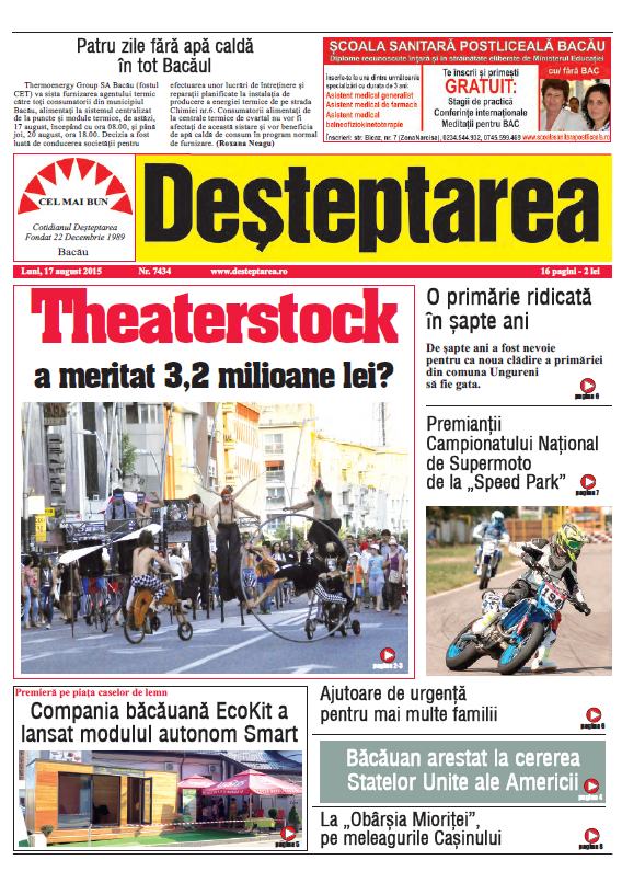 Pagina 1 Deșteptarea 16 august 2015 Acțiune FacebookTwitterWhatsAppTelegramVK Acțiune FacebookTwitterWhatsAppTelegramVK Informare privind cele mai bune practici de utilizare a produselor biocide Decembrie 2025 Moș Nicolae a venit și la copiii internați la „Pediatrie” Profesori din România, participanți în premieră la Conferința Internațională „Holocaust Public Memory in the Post-Survivor Era: Integrating Digital Mnemonic Tools in Museums” Ziua Internațională a Voluntariatului celebrată la Cercul Militar Bacău Fotbal/ Liga 2: FC Bacău a făcut instrucție cu Steaua! Autostrada A7: Progrese majore pe Lotul 1 Focșani – Bacău. Imagini comparative arată ritmul alert al constructorului român UMB Polițiștii băcăuani desfășoară acțiuni de prevenire a violenței domestice la centre comerciale Gala Voluntarului Băcăuan 2025 – 200 de voluntari celebrați la ediția a XVII-a, organizată în contextul Zilei Internaționale a Voluntariatului Scheletul din dulapul Uniunii Europene Tânăr de 21 de ani, reținut după ce a condus fără permis și a folosit plăcuțe de înmatriculare false Hramul Sfintei Varvara și sinaxa preoților din Protopopiatul Onești, celebrate la 240 de metri adâncime în Salina Târgu Ocna Șezătoarea de la Măgura, o punte între generații și tradiții