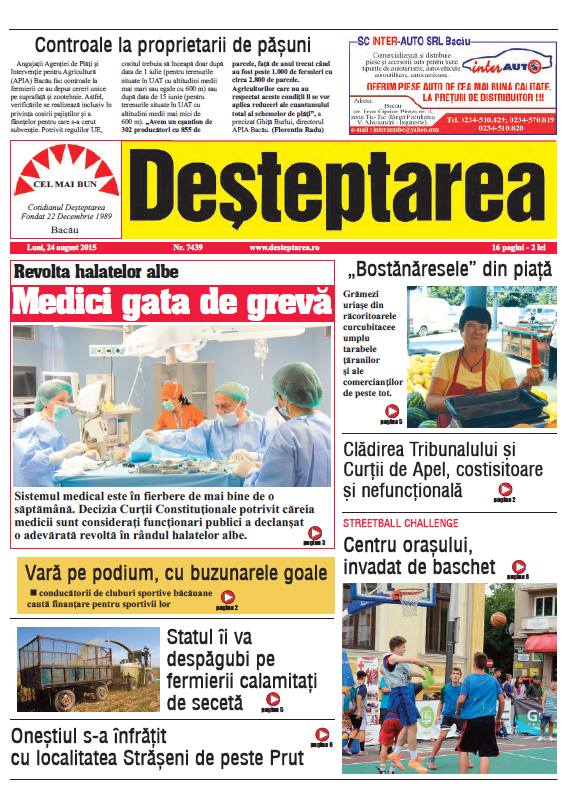 Pagina 1 Deșteptarea 23 august 2015 Acțiune FacebookTwitterWhatsAppTelegramVK Acțiune FacebookTwitterWhatsAppTelegramVK Informare privind cele mai bune practici de utilizare a produselor biocide Decembrie 2025 Moș Nicolae a venit și la copiii internați la „Pediatrie” Profesori din România, participanți în premieră la Conferința Internațională „Holocaust Public Memory in the Post-Survivor Era: Integrating Digital Mnemonic Tools in Museums” Ziua Internațională a Voluntariatului celebrată la Cercul Militar Bacău Fotbal/ Liga 2: FC Bacău a făcut instrucție cu Steaua! Autostrada A7: Progrese majore pe Lotul 1 Focșani – Bacău. Imagini comparative arată ritmul alert al constructorului român UMB Polițiștii băcăuani desfășoară acțiuni de prevenire a violenței domestice la centre comerciale Gala Voluntarului Băcăuan 2025 – 200 de voluntari celebrați la ediția a XVII-a, organizată în contextul Zilei Internaționale a Voluntariatului Scheletul din dulapul Uniunii Europene Tânăr de 21 de ani, reținut după ce a condus fără permis și a folosit plăcuțe de înmatriculare false Hramul Sfintei Varvara și sinaxa preoților din Protopopiatul Onești, celebrate la 240 de metri adâncime în Salina Târgu Ocna Șezătoarea de la Măgura, o punte între generații și tradiții