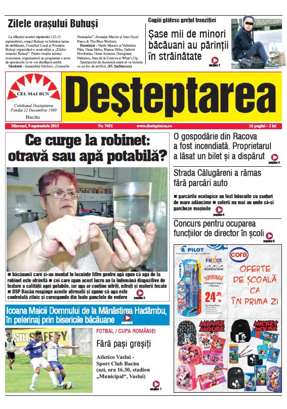 Pagina 1 Deșteptarea 8 septembrie 2015 Acțiune FacebookTwitterWhatsAppTelegramVK Acțiune FacebookTwitterWhatsAppTelegramVK Hramul Sfintei Varvara și sinaxa preoților din Protopopiatul Onești, celebrate la 240 de metri adâncime în Salina Târgu Ocna Șezătoarea de la Măgura, o punte între generații și tradiții Percheziții și 12 autovehicule puse sub sechestru într-un dosar de evaziune fiscală de 150.000 de lei Jandarmii băcăuani au oferit daruri de Moș Nicolae unor copii din Stănișesti Gala Ecosistemului Antreprenorial al Universității «Vasile Alecsandri» Un mister din 1973… în Steagul roșu Fotbalul băcăuan la 360 de grade Depopularea continuă dar septembrie aduce o surpriză demografică Cum să ai grijă corect de parfumul tău Handbal juvenil: Prima ediție a Memorialului „Marcel Păunică” Polițiștii băcăuani, în sprijinul comunității: recomandări pentru sărbători în siguranță Intervenție laparoscopică reușită pentru tratarea infertilității cauzate de varicocel