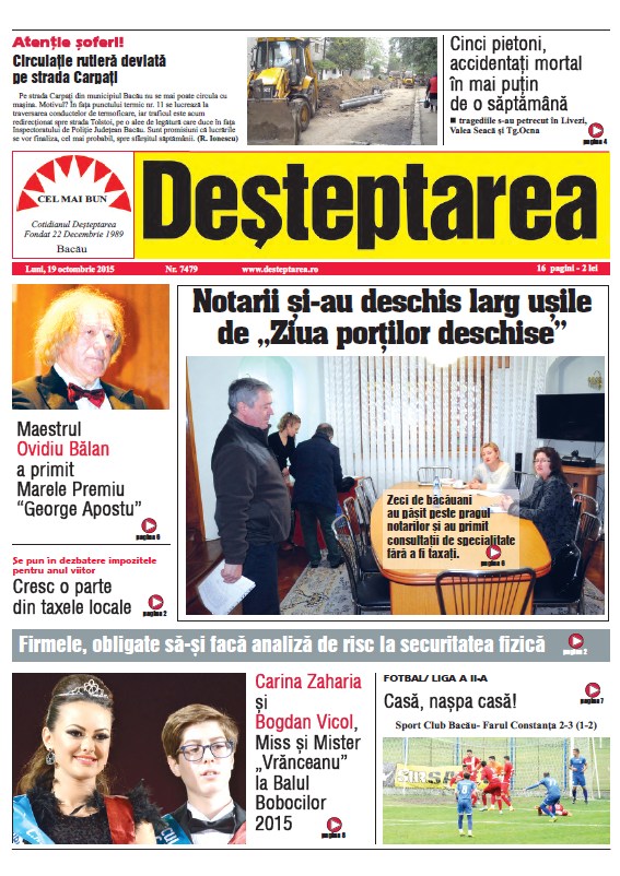 Pagina 1 Deșteptarea 18 octombrie 2015 Acțiune FacebookTwitterWhatsAppTelegramVK Acțiune FacebookTwitterWhatsAppTelegramVK Polițiștii băcăuani, în sprijinul comunității: recomandări pentru sărbători în siguranță Intervenție laparoscopică reușită pentru tratarea infertilității cauzate de varicocel 40 de kilograme de articole pirotehnice, deținute ilegal, descoperite de polițiștii băcăuani Când se organizează Alaiul Datinilor și Obiceiurilor de Iarnă în Bacău Trei cazuri noi de gripă și peste 1.500 de infecții respiratorii în județul Bacău Concursul Național Interdisciplinar „Vrănceanu – Procopiu” Bacău, ediția a XXIV-a, 2025 Cum transformă perdelele atmosfera din orice locuință „Once Upon a Ball – Povestea Bobocilor” de la Liceul „Borcea” Buhuși Primarul Lucian-Daniel Stanciu-Viziteu: „Vom continua și anul viitor dezvoltarea municipiului Bacău prin investiții” Sărbătoare în inima Bacăului: Hramul „Sfântul Nicolae” și 20 de ani de la sfințirea bisericii „Sfinții Petru și Paul” O lege mută elevii de clasa a VIII-a exclusiv în programul de dimineață WDSF Bacău Dance Open 2025 – Un spectacol de pasiune și eleganță pe ringul de dans