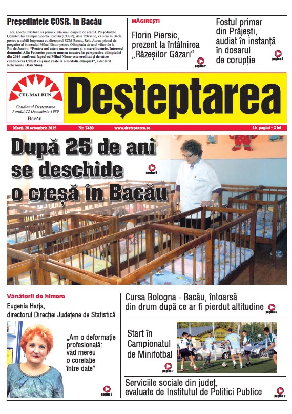 Pagina 1 Deșteptarea 19 octombrie 2015 Acțiune FacebookTwitterWhatsAppTelegramVK Acțiune FacebookTwitterWhatsAppTelegramVK Polițiștii băcăuani, în sprijinul comunității: recomandări pentru sărbători în siguranță Intervenție laparoscopică reușită pentru tratarea infertilității cauzate de varicocel 40 de kilograme de articole pirotehnice, deținute ilegal, descoperite de polițiștii băcăuani Când se organizează Alaiul Datinilor și Obiceiurilor de Iarnă în Bacău Trei cazuri noi de gripă și peste 1.500 de infecții respiratorii în județul Bacău Concursul Național Interdisciplinar „Vrănceanu – Procopiu” Bacău, ediția a XXIV-a, 2025 Cum transformă perdelele atmosfera din orice locuință „Once Upon a Ball – Povestea Bobocilor” de la Liceul „Borcea” Buhuși Primarul Lucian-Daniel Stanciu-Viziteu: „Vom continua și anul viitor dezvoltarea municipiului Bacău prin investiții” Sărbătoare în inima Bacăului: Hramul „Sfântul Nicolae” și 20 de ani de la sfințirea bisericii „Sfinții Petru și Paul” O lege mută elevii de clasa a VIII-a exclusiv în programul de dimineață WDSF Bacău Dance Open 2025 – Un spectacol de pasiune și eleganță pe ringul de dans