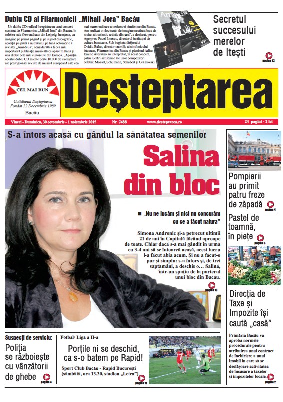 Pagina 1 Deșteptarea 29 octombrie 2015 Acțiune FacebookTwitterWhatsAppTelegramVK Acțiune FacebookTwitterWhatsAppTelegramVK Polițiștii băcăuani, în sprijinul comunității: recomandări pentru sărbători în siguranță Intervenție laparoscopică reușită pentru tratarea infertilității cauzate de varicocel 40 de kilograme de articole pirotehnice, deținute ilegal, descoperite de polițiștii băcăuani Când se organizează Alaiul Datinilor și Obiceiurilor de Iarnă în Bacău Trei cazuri noi de gripă și peste 1.500 de infecții respiratorii în județul Bacău Concursul Național Interdisciplinar „Vrănceanu – Procopiu” Bacău, ediția a XXIV-a, 2025 Cum transformă perdelele atmosfera din orice locuință „Once Upon a Ball – Povestea Bobocilor” de la Liceul „Borcea” Buhuși Primarul Lucian-Daniel Stanciu-Viziteu: „Vom continua și anul viitor dezvoltarea municipiului Bacău prin investiții” Sărbătoare în inima Bacăului: Hramul „Sfântul Nicolae” și 20 de ani de la sfințirea bisericii „Sfinții Petru și Paul” O lege mută elevii de clasa a VIII-a exclusiv în programul de dimineață WDSF Bacău Dance Open 2025 – Un spectacol de pasiune și eleganță pe ringul de dans