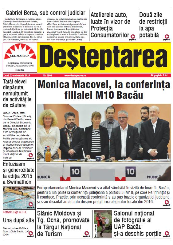 Pagina 1 Deșteptarea 22 noiembrie 2015 Acțiune FacebookTwitterWhatsAppTelegramVK Acțiune FacebookTwitterWhatsAppTelegramVK Hramul Sfintei Varvara și sinaxa preoților din Protopopiatul Onești, celebrate la 240 de metri adâncime în Salina Târgu Ocna Șezătoarea de la Măgura, o punte între generații și tradiții Percheziții și 12 autovehicule puse sub sechestru într-un dosar de evaziune fiscală de 150.000 de lei Jandarmii băcăuani au oferit daruri de Moș Nicolae unor copii din Stănișesti Gala Ecosistemului Antreprenorial al Universității «Vasile Alecsandri» Un mister din 1973… în Steagul roșu Fotbalul băcăuan la 360 de grade Depopularea continuă dar septembrie aduce o surpriză demografică Cum să ai grijă corect de parfumul tău Handbal juvenil: Prima ediție a Memorialului „Marcel Păunică” Polițiștii băcăuani, în sprijinul comunității: recomandări pentru sărbători în siguranță Intervenție laparoscopică reușită pentru tratarea infertilității cauzate de varicocel