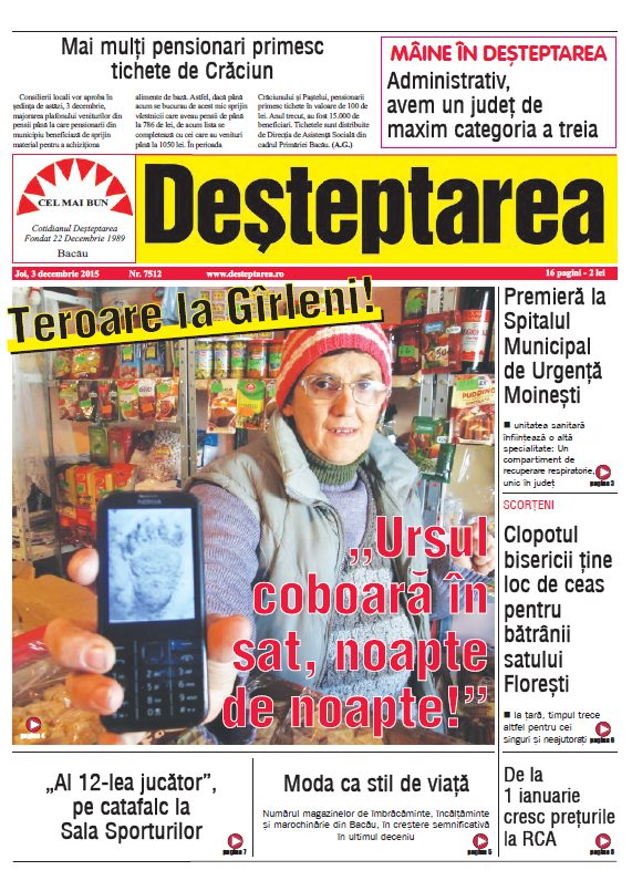 Pagina 1 Deșteptarea 2 decembrie 2015 Acțiune FacebookTwitterWhatsAppTelegramVK Acțiune FacebookTwitterWhatsAppTelegramVK Hramul Sfintei Varvara și sinaxa preoților din Protopopiatul Onești, celebrate la 240 de metri adâncime în Salina Târgu Ocna Șezătoarea de la Măgura, o punte între generații și tradiții Percheziții și 12 autovehicule puse sub sechestru într-un dosar de evaziune fiscală de 150.000 de lei Jandarmii băcăuani au oferit daruri de Moș Nicolae unor copii din Stănișesti Gala Ecosistemului Antreprenorial al Universității «Vasile Alecsandri» Un mister din 1973… în Steagul roșu Fotbalul băcăuan la 360 de grade Depopularea continuă dar septembrie aduce o surpriză demografică Cum să ai grijă corect de parfumul tău Handbal juvenil: Prima ediție a Memorialului „Marcel Păunică” Polițiștii băcăuani, în sprijinul comunității: recomandări pentru sărbători în siguranță Intervenție laparoscopică reușită pentru tratarea infertilității cauzate de varicocel