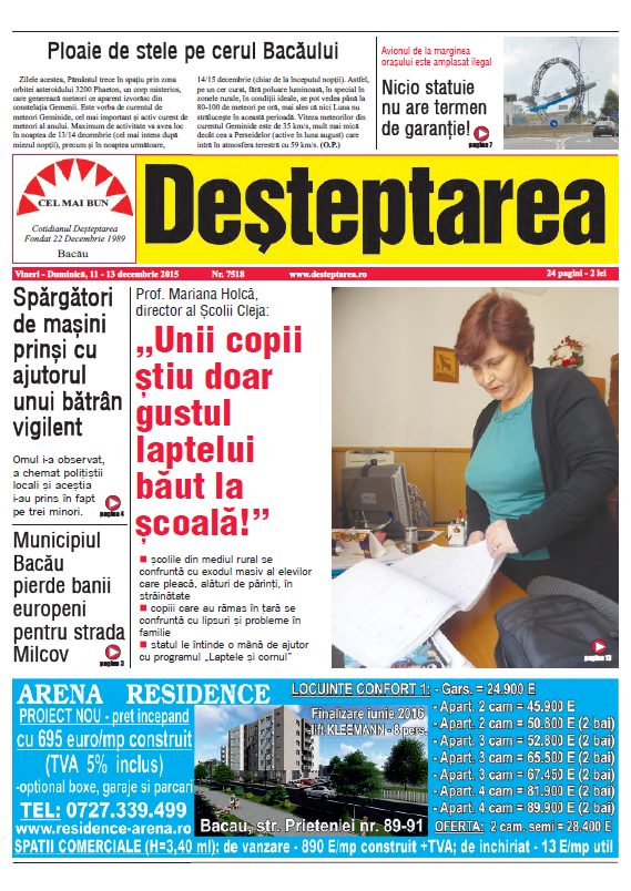 Pagina 1 Deșteptarea 10 decembrie 2015 Acțiune FacebookTwitterWhatsAppTelegramVK Acțiune FacebookTwitterWhatsAppTelegramVK Scheletul din dulapul Uniunii Europene Tânăr de 21 de ani, reținut după ce a condus fără permis și a folosit plăcuțe de înmatriculare false Hramul Sfintei Varvara și sinaxa preoților din Protopopiatul Onești, celebrate la 240 de metri adâncime în Salina Târgu Ocna Șezătoarea de la Măgura, o punte între generații și tradiții Percheziții și 12 autovehicule puse sub sechestru într-un dosar de evaziune fiscală de 150.000 de lei Jandarmii băcăuani au oferit daruri de Moș Nicolae unor copii din Stănișesti Gala Ecosistemului Antreprenorial al Universității «Vasile Alecsandri» Un mister din 1973… în Steagul roșu Fotbalul băcăuan la 360 de grade Depopularea continuă dar septembrie aduce o surpriză demografică Cum să ai grijă corect de parfumul tău Handbal juvenil: Prima ediție a Memorialului „Marcel Păunică”
