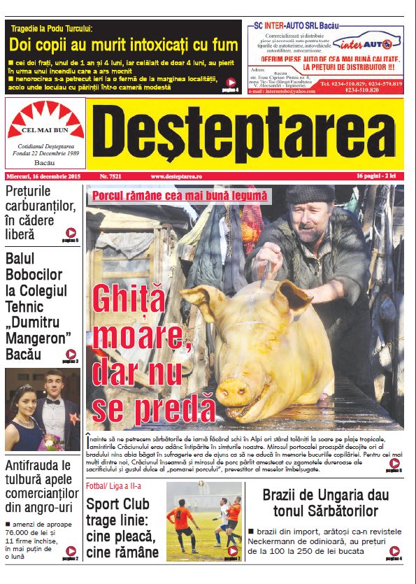 Pagina 1 Deșteptarea 15 decembrie 2015 Acțiune FacebookTwitterWhatsAppTelegramVK Acțiune FacebookTwitterWhatsAppTelegramVK Scheletul din dulapul Uniunii Europene Tânăr de 21 de ani, reținut după ce a condus fără permis și a folosit plăcuțe de înmatriculare false Hramul Sfintei Varvara și sinaxa preoților din Protopopiatul Onești, celebrate la 240 de metri adâncime în Salina Târgu Ocna Șezătoarea de la Măgura, o punte între generații și tradiții Percheziții și 12 autovehicule puse sub sechestru într-un dosar de evaziune fiscală de 150.000 de lei Jandarmii băcăuani au oferit daruri de Moș Nicolae unor copii din Stănișesti Gala Ecosistemului Antreprenorial al Universității «Vasile Alecsandri» Un mister din 1973… în Steagul roșu Fotbalul băcăuan la 360 de grade Depopularea continuă dar septembrie aduce o surpriză demografică Cum să ai grijă corect de parfumul tău Handbal juvenil: Prima ediție a Memorialului „Marcel Păunică”