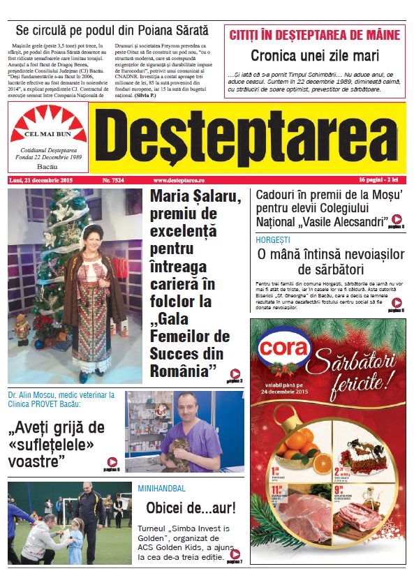 Pagina 1 Deșteptarea 20 decembrie 2015 Acțiune FacebookTwitterWhatsAppTelegramVK Acțiune FacebookTwitterWhatsAppTelegramVK Ziua Internațională a Voluntariatului celebrată la Cercul Militar Bacău Fotbal/ Liga 2: FC Bacău a făcut instrucție cu Steaua! Autostrada A7: Progrese majore pe Lotul 1 Focșani – Bacău. Imagini comparative arată ritmul alert al constructorului român UMB Polițiștii băcăuani desfășoară acțiuni de prevenire a violenței domestice la centre comerciale Gala Voluntarului Băcăuan 2025 – 200 de voluntari celebrați la ediția a XVII-a, organizată în contextul Zilei Internaționale a Voluntariatului Scheletul din dulapul Uniunii Europene Tânăr de 21 de ani, reținut după ce a condus fără permis și a folosit plăcuțe de înmatriculare false Hramul Sfintei Varvara și sinaxa preoților din Protopopiatul Onești, celebrate la 240 de metri adâncime în Salina Târgu Ocna Șezătoarea de la Măgura, o punte între generații și tradiții Percheziții și 12 autovehicule puse sub sechestru într-un dosar de evaziune fiscală de 150.000 de lei Jandarmii băcăuani au oferit daruri de Moș Nicolae unor copii din Stănișesti Gala Ecosistemului Antreprenorial al Universității «Vasile Alecsandri»