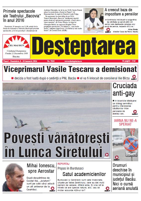 Pagina 1 Deșteptarea 7 ianuarie 2016 Acțiune FacebookTwitterWhatsAppTelegramVK Acțiune FacebookTwitterWhatsAppTelegramVK Informare privind cele mai bune practici de utilizare a produselor biocide Decembrie 2025 Moș Nicolae a venit și la copiii internați la „Pediatrie” Profesori din România, participanți în premieră la Conferința Internațională „Holocaust Public Memory in the Post-Survivor Era: Integrating Digital Mnemonic Tools in Museums” Ziua Internațională a Voluntariatului celebrată la Cercul Militar Bacău Fotbal/ Liga 2: FC Bacău a făcut instrucție cu Steaua! Autostrada A7: Progrese majore pe Lotul 1 Focșani – Bacău. Imagini comparative arată ritmul alert al constructorului român UMB Polițiștii băcăuani desfășoară acțiuni de prevenire a violenței domestice la centre comerciale Gala Voluntarului Băcăuan 2025 – 200 de voluntari celebrați la ediția a XVII-a, organizată în contextul Zilei Internaționale a Voluntariatului Scheletul din dulapul Uniunii Europene Tânăr de 21 de ani, reținut după ce a condus fără permis și a folosit plăcuțe de înmatriculare false Hramul Sfintei Varvara și sinaxa preoților din Protopopiatul Onești, celebrate la 240 de metri adâncime în Salina Târgu Ocna Șezătoarea de la Măgura, o punte între generații și tradiții