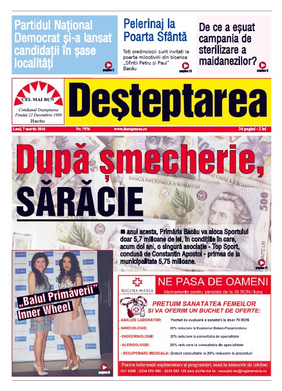 Pagina 1 Deșteptarea 6 martie 2016 Acțiune FacebookTwitterWhatsAppTelegramVK Acțiune FacebookTwitterWhatsAppTelegramVK Tenis: ACS Moldosport, final de an în prim-plan Doi tineri reținuți după ce au încercat să fure telefoane dintr-un easybox, în Bacău Aurora Multimarket dă startul sezonului de iarnă cu reduceri de până la 90%! Fotbal/ Liga 2: FC Bacău o spulberă cu 5-1 pe Ceahlăul în deplasare și încheie anul în forță! A7 Moldova: Lucrări avansate la trecerea Berești-Sascut, aproape de finalizare „Retorta de argint” și alte lumi dispărute: amintiri despre festivalurile muncitorești Bacăul accelerează în topul salarial al Moldovei: industria trage județul înainte Box: ACS Dan Gym Box, clubul de bronz cu oameni de aur Guvernul limitează cantitățile de alcool și tutun pentru uz personal: maximum 10 litri de băuturi spirtoase Scos din trafic de polițiștii rutieri și introdus în arest Exercițiu de evacuare și prim ajutor la Spitalul Județean de Urgență Bacău, simulând un cutremur în zona Vrancea Spitalul „Prof. Dr. Eduard Apetrei” Buhuși deschide dialogul cu pacienții, într-o întâlnire programată pe 23 decembrie