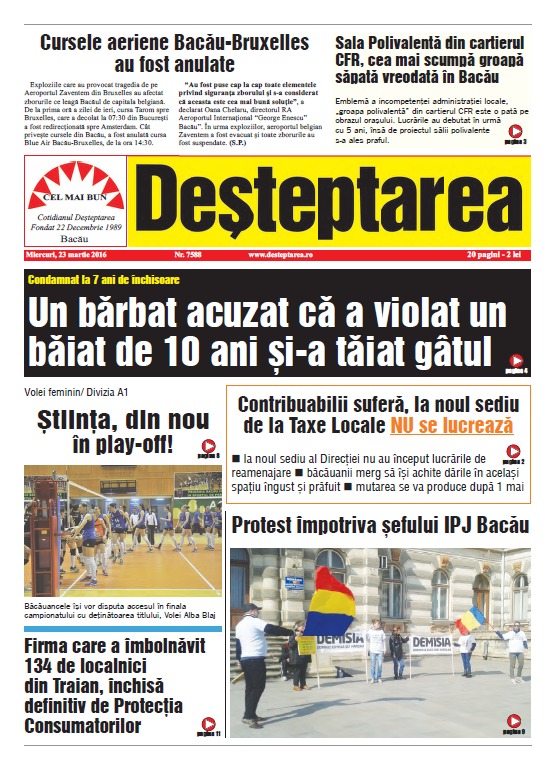 Pagina 1 Deșteptarea 22 martie 2016 Acțiune FacebookTwitterWhatsAppTelegramVK Acțiune FacebookTwitterWhatsAppTelegramVK Aurora Multimarket dă startul sezonului de iarnă cu reduceri de până la 90%! Fotbal/ Liga 2: FC Bacău o spulberă cu 5-1 pe Ceahlăul în deplasare și încheie anul în forță! A7 Moldova: Lucrări avansate la trecerea Berești-Sascut, aproape de finalizare „Retorta de argint” și alte lumi dispărute: amintiri despre festivalurile muncitorești Bacăul accelerează în topul salarial al Moldovei: industria trage județul înainte Box: ACS Dan Gym Box, clubul de bronz cu oameni de aur Guvernul limitează cantitățile de alcool și tutun pentru uz personal: maximum 10 litri de băuturi spirtoase Scos din trafic de polițiștii rutieri și introdus în arest Exercițiu de evacuare și prim ajutor la Spitalul Județean de Urgență Bacău, simulând un cutremur în zona Vrancea Spitalul „Prof. Dr. Eduard Apetrei” Buhuși deschide dialogul cu pacienții, într-o întâlnire programată pe 23 decembrie Două dintre cele mai valoroase companii din România sunt din Bacău, conform Ziarului Financiar Bacău: Universitatea „Vasile Alecsandri” a organizat serbarea de Crăciun