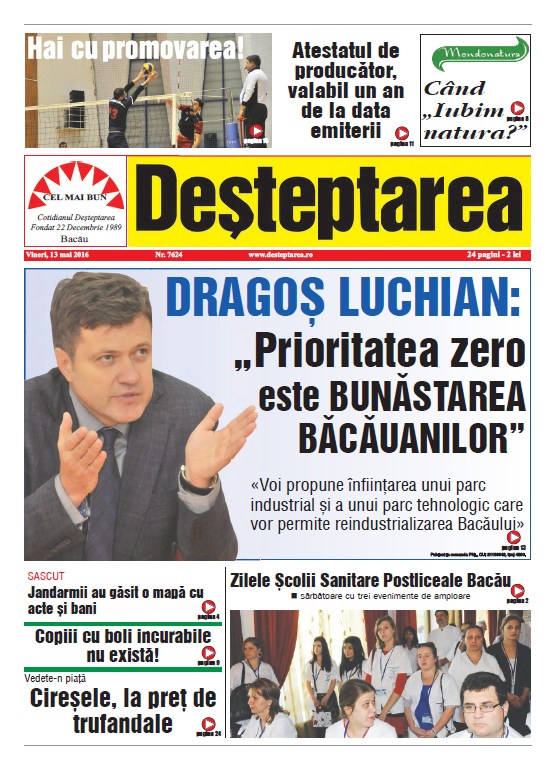 Pagina 1 Deșteptarea 12 mai 2016 Acțiune FacebookTwitterWhatsAppTelegramVK Acțiune FacebookTwitterWhatsAppTelegramVK Insula Misterioasă la balul Bobocilor de la Liceul Teoretic „Henri Coandă” Bacău Ziua Internațională a Voluntariatului celebrată prin concurs de mediu la Palatul Copiilor Bacău U17 FC Viitorul Onești, calificare dramatică în optimile Cupei României Obținerea permisului de conducere, mai simplă: cazierul judiciar este verificat direct la ghișeu Avertisment dur de la Garda de Mediu Bacău: un operator economic din Ardeoani, sancționat drastic pentru poluare Jandarmii băcăuani i-au adus căldură lui Nea Vasile, 74 de ani Fotbal/ Liga 3: Viitorul Onești câștigă, FC Bacău 2 încheie la egalitate un meci dramatic, iar Aerostar pierde acasă Clubul Sportiv Bronx, rezultate remarcabile la competiția din Houlegate, Franța Conferința „Excelență, inovație și performanță în medicină” – un eveniment de referință pentru comunitatea medicală băcăuană Sub semnul recunoștinței și al binelui comun la hramul bisericii „Sfântul Nicolae” din Bacău Elevi ai Liceului Tehnologic Târgu Ocna, în recital la „Sunetul colindelor în inima muntelui de sare” Spitalul din Buhuși va deschide în 2026 un program de chirurgie robotică – un pas major pentru medicina din nord-estul țării