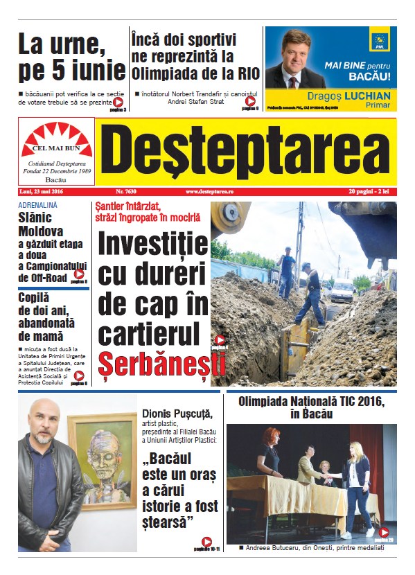 Pagina 1 Deșteptarea 22 mai 2016 Acțiune FacebookTwitterWhatsAppTelegramVK Acțiune FacebookTwitterWhatsAppTelegramVK Centrul Bacăului în anii ’80 Cum era să intre un șofer într-o ambulanță pentru că nu a respectat semnalele acustice și luminoase Județul Bacău, sub cod portocaliu de vânt. Autoritățile recomandă evitarea deplasărilor Inspectoratul de Poliție Județean Bacău atrage atenția participanților la trafic asupra circulației în condiții de iarnă O inovație discretă care a ținut luminile aprinse Consiliul Județean Bacău: Acces gratuit la cultură și taxe ajustate doar cu rata inflației în anul 2026 Cod portocaliu: Vânt și ninsoare Doi pacienți cu arsuri grave din Onești, transferați în Belgia cu o aeronavă medicală a Forțelor Aeriene Române Guvernul taie alocația de hrană pentru cei 137 de copii cu handicap de tip HIV/SIDA La final de an, o altfel de poveste. De la capăt de lume, despre capătul unor lumi Deputatul Diana Enache la festivitățile de iarnă din Bacău Alaiul datinilor strămoșești – VIDEO