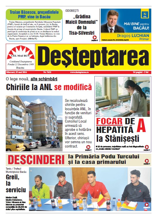 Pagina 1 Deșteptarea 24 mai 2016 Acțiune FacebookTwitterWhatsAppTelegramVK Acțiune FacebookTwitterWhatsAppTelegramVK Fotbal/ Liga 2: FC Bacău pregătește ultimul meci al anului: derby-ul cu Ceahlăul S-a deschis Atletic Park. Cum arată Incendiu la o locuință din Slănic Moldova Cum alegi pensulele de machiaj și produsele care completează rutina perfectă Volei: Turneu internațional de old-boys la Sala Sporturilor „Narcisa Lecușanu” Rolul unui stil de viață activ și al vitaminelor Și școala poate fi numită acasă Onești: Spitalul Municipal introduce aparatură de nivel universitar pentru proceduri gastroenterologice avansate Zilele libere legale în 2026: ce program vor avea salariații români Se deschide Athletic Park Bacău – un nou reper sportiv pentru comunitate Activitățile ISU Bacău în noiembrie: pregătirea și reziliența comunităților SJU Bacău organizează exercițiu de simulare a unui cutremur pe 12 decembrie
