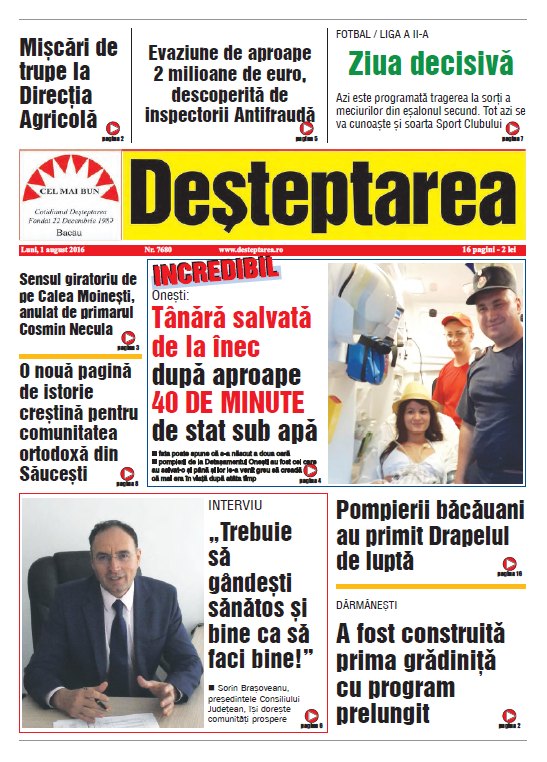 Pagina 1 Deșteptarea 31 iulie 2016 Acțiune FacebookTwitterWhatsAppTelegramVK Acțiune FacebookTwitterWhatsAppTelegramVK Fotbal/ Liga 3: Viitorul Onești câștigă, FC Bacău 2 încheie la egalitate un meci dramatic, iar Aerostar pierde acasă Clubul Sportiv Bronx, rezultate remarcabile la competiția din Houlegate, Franța Conferința „Excelență, inovație și performanță în medicină” – un eveniment de referință pentru comunitatea medicală băcăuană Sub semnul recunoștinței și al binelui comun la hramul bisericii „Sfântul Nicolae” din Bacău Elevi ai Liceului Tehnologic Târgu Ocna, în recital la „Sunetul colindelor în inima muntelui de sare” Spitalul din Buhuși va deschide în 2026 un program de chirurgie robotică – un pas major pentru medicina din nord-estul țării Când Cel Drept vindecă gârbovirea celei smerite (Luca 13, 10- 17) Duminica a II din Advent Acțiunea Conservatoare Bacău a constituit organizația locală Onești Informare privind cele mai bune practici de utilizare a produselor biocide Decembrie 2025 Moș Nicolae a venit și la copiii internați la „Pediatrie” Profesori din România, participanți în premieră la Conferința Internațională „Holocaust Public Memory in the Post-Survivor Era: Integrating Digital Mnemonic Tools in Museums”