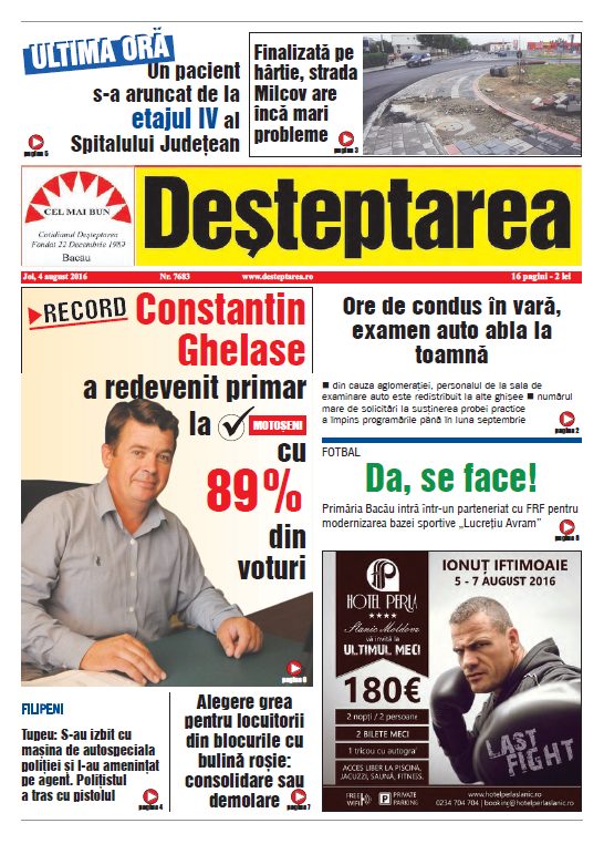 Pagina 1 Deșteptarea 3 august 2016 Acțiune FacebookTwitterWhatsAppTelegramVK Acțiune FacebookTwitterWhatsAppTelegramVK Mihai Badiu, directorul Filarmonicii ”Mihail Jora” din Bacău: ”Îmi doresc ca importanța instituției să crească în comunitate” Cadouri de la ISU Prima licitație pentru locurile de parcare de reședință, programată în ianuarie 2026 Daniel David și-a dat demisia din funcția de ministru al Educației. Nemulțumiri legate de buget și de viitoarele tăieri anunțate de Guvern Polițiștii de la Serviciul pentru Acțiuni Speciale Bacău au poposit în casele celor care au nevoie de ajutor Gimnastică: Și lui Moș Crăciun îi place gimnastica Containerele de locuit – tehnologia care redefineşte conceptul de „acasă” Piticii de la Grădinița „Dumbrava Minunată” au adus bucurie bunicilor de la Căminul „Brațe Părintești” Jandarmii băcăuani și-au deschis porțile pentru elevii din Onești Când marii fotbaliști ai Bacăului apărau și atacau porțile Europei 36 de ani de la Revoluția Română din 1989. Depunere de coroane de flori la Cimitirul Central Școala Gimnazială „Constantin Platon”, câștigătoarea Târgului de Crăciun al Școlilor din Bacău