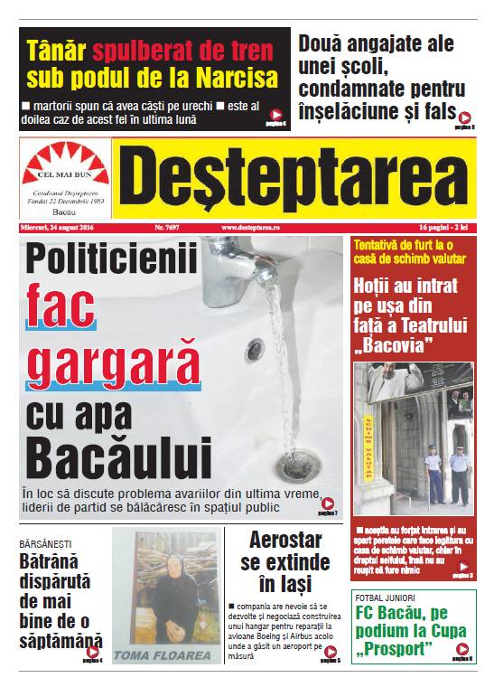 Pagina 1 Deșteptarea 23 august 2016 Acțiune FacebookTwitterWhatsAppTelegramVK Acțiune FacebookTwitterWhatsAppTelegramVK Dublă lansare de carte la Centrul de Cultură „George Apostu”, cu Carmen Mihalache și Dan Perșa Creștere a infecțiilor respiratorii în județul Bacău. Opt cazuri noi de gripă în ultima săptămână Pesta porcină africană confirmată la Itești Pompierii au verificat adăposturile antiaeriene. Doar 6% din populația județului încape în ele Burnout-ul de sărbători. De ce nu ne simțim mai bine după vacanță, ci mai obosiți „Genealogii imaginare”. Expoziție de sculptură Marian Petre Intervenție chirurgicală minim invazivă de excepție, realizată la Secția de Chirurgie și Ortopedie Pediatrică a SJU Bacău Fotbal/ Liga 3: Etapă de final de an Incendiu într-un apartament din Moinești: 27 de persoane evacuate în siguranță Dedeman continuă consolidarea rețelei naționale prin deschiderea unui nou magazin în Mediaș SCM Bacău: Un destin sub zodia performanței ! Chimcomplex SA Borzești- convocare A.G.O.A.