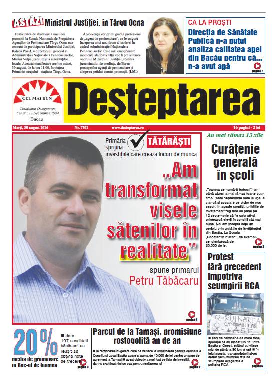 Pagina 1 Deșteptarea 29 august 2016 Acțiune FacebookTwitterWhatsAppTelegramVK Acțiune FacebookTwitterWhatsAppTelegramVK Două dintre cele mai valoroase companii din România sunt din Bacău, conform Ziarului Financiar Bacău: Universitatea „Vasile Alecsandri” a organizat serbarea de Crăciun Dublă lansare de carte la Centrul de Cultură „George Apostu”, cu Carmen Mihalache și Dan Perșa Creștere a infecțiilor respiratorii în județul Bacău. Opt cazuri noi de gripă în ultima săptămână Pesta porcină africană confirmată la Itești Pompierii au verificat adăposturile antiaeriene. Doar 6% din populația județului încape în ele Burnout-ul de sărbători. De ce nu ne simțim mai bine după vacanță, ci mai obosiți „Genealogii imaginare”. Expoziție de sculptură Marian Petre Intervenție chirurgicală minim invazivă de excepție, realizată la Secția de Chirurgie și Ortopedie Pediatrică a SJU Bacău Fotbal/ Liga 3: Etapă de final de an Incendiu într-un apartament din Moinești: 27 de persoane evacuate în siguranță Dedeman continuă consolidarea rețelei naționale prin deschiderea unui nou magazin în Mediaș