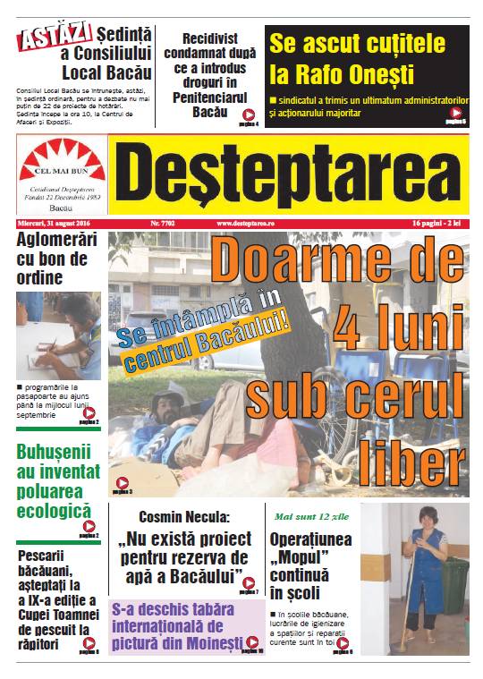 Pagina 1 Deșteptarea 30 august 2016 Acțiune FacebookTwitterWhatsAppTelegramVK Acțiune FacebookTwitterWhatsAppTelegramVK Ședința lunară ATOP Bacău, găzduită de Inspectoratul de Jandarmi Județean „Ștefan cel Mare” Când muzica devine terapie: un concert de Crăciun în premiera la Bacău Concertul de Colinde (Ediția a III‑a 2025) a jandarmilor băcăuani Polițiștii băcăuani au oferit ajutor și susținere unui tânăr pasionat de box De la Oituz la „Mica Românie” din Londra. Povestea unui tânăr care a dus gustul de acasă peste hotare Judo: CSM- Palatul Copiilor Bacău, la nivel de excelență Duminica a IV din Advent Handbal feminin/ Cupa României: Știința Bacău, calificată în faza următoare Un sfârșit de an 2025 incendiar pentru micii practicanți de QWAN-KI-DO Polițiștii băcăuani au adus bucurie copiilor, în prag de sărbători Percheziții în Gura Văii într-un dosar de furt calificat. Prejudiciu de peste 1,7 milioane de lei Magia nevăzută a sărbătorilor- povestea celui mai prețios cadou
