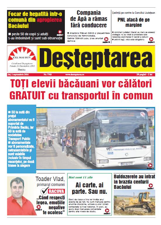 Pagina 1 Deșteptarea 31 august 2016 Acțiune FacebookTwitterWhatsAppTelegramVK Acțiune FacebookTwitterWhatsAppTelegramVK Spitalul „Prof. Dr. Eduard Apetrei” Buhuși deschide dialogul cu pacienții, într-o întâlnire programată pe 23 decembrie Două dintre cele mai valoroase companii din România sunt din Bacău, conform Ziarului Financiar Bacău: Universitatea „Vasile Alecsandri” a organizat serbarea de Crăciun Dublă lansare de carte la Centrul de Cultură „George Apostu”, cu Carmen Mihalache și Dan Perșa Creștere a infecțiilor respiratorii în județul Bacău. Opt cazuri noi de gripă în ultima săptămână Pesta porcină africană confirmată la Itești Pompierii au verificat adăposturile antiaeriene. Doar 6% din populația județului încape în ele Burnout-ul de sărbători. De ce nu ne simțim mai bine după vacanță, ci mai obosiți „Genealogii imaginare”. Expoziție de sculptură Marian Petre Intervenție chirurgicală minim invazivă de excepție, realizată la Secția de Chirurgie și Ortopedie Pediatrică a SJU Bacău Fotbal/ Liga 3: Etapă de final de an Incendiu într-un apartament din Moinești: 27 de persoane evacuate în siguranță