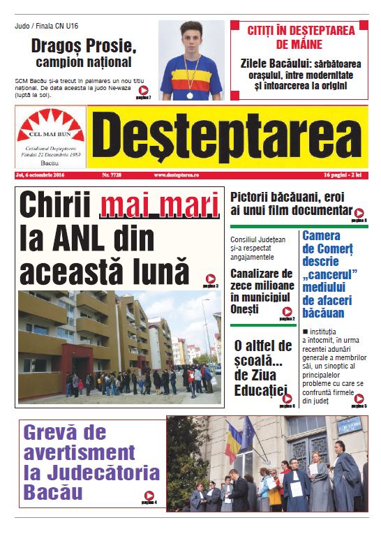 Pagina 1 Deșteptarea 5 octombrie 2016 Acțiune FacebookTwitterWhatsAppTelegramVK Acțiune FacebookTwitterWhatsAppTelegramVK Muzica Militară a Garnizoanei Bacău aduce colindul la Spitalul Județean de Urgență Promoții cu gust autentic românesc 16-23 Decembrie „Școala altfel”, alături de polițiști: Concurs de kendama, antidot al bullyingului și alternativă de fair-play și camaraderie Efectele digitalizării raportărilor fiscale se lasă așteptate – TVA neîncasată, din nou în creștere Drumul Expres Bacău–Piatra Neamț face un pas decisiv: constructor desemnat pentru proiectul așteptat de ani de zile Șah: Cupa de Crăciun a ajuns la ediția cu numărul șapte Incendiu la un apartament în Bacău Braconaj la Itești: mistreț împușcat ilegal Ultima apariție a ziarului „Steagul roșu” – 16 decembrie 1989 Reges-Online devine obligatoriu de la 1 ianuarie 2026. Ultimele zile pentru migrarea din Revisal Gala Performanței Sportive: gratitudine pentru 2025, motivație pentru 2026 Gala Educației – 1.000 de laureați din Educația Băcăuană, recompensați pentru excelență