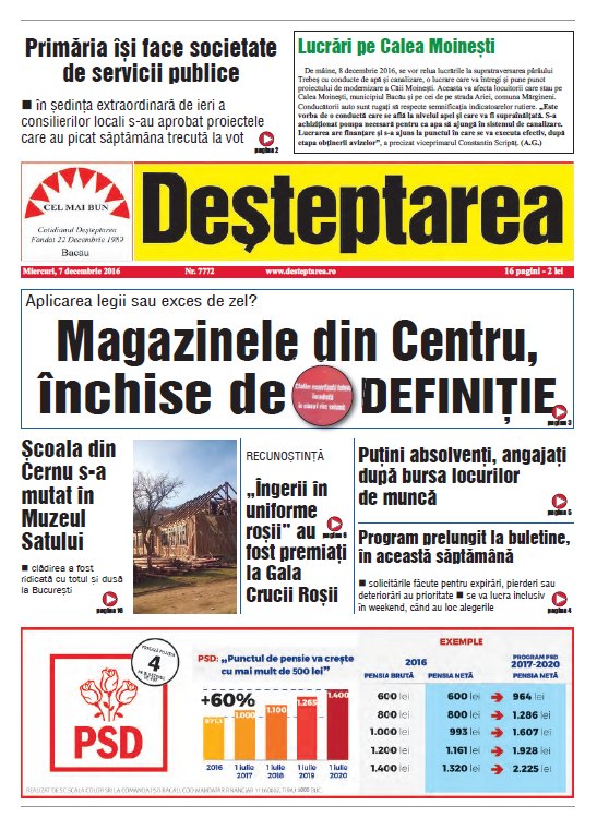 Pagina 1 Deșteptarea 6 decembrie 2016 Acțiune FacebookTwitterWhatsAppTelegramVK Acțiune FacebookTwitterWhatsAppTelegramVK Fotbal: Ne-a părăsit Ioan Sdrobiș! Insula Misterioasă la balul Bobocilor de la Liceul Teoretic „Henri Coandă” Bacău Ziua Internațională a Voluntariatului celebrată prin concurs de mediu la Palatul Copiilor Bacău U17 FC Viitorul Onești, calificare dramatică în optimile Cupei României Obținerea permisului de conducere, mai simplă: cazierul judiciar este verificat direct la ghișeu Avertisment dur de la Garda de Mediu Bacău: un operator economic din Ardeoani, sancționat drastic pentru poluare Jandarmii băcăuani i-au adus căldură lui Nea Vasile, 74 de ani Fotbal/ Liga 3: Viitorul Onești câștigă, FC Bacău 2 încheie la egalitate un meci dramatic, iar Aerostar pierde acasă Clubul Sportiv Bronx, rezultate remarcabile la competiția din Houlegate, Franța Conferința „Excelență, inovație și performanță în medicină” – un eveniment de referință pentru comunitatea medicală băcăuană Sub semnul recunoștinței și al binelui comun la hramul bisericii „Sfântul Nicolae” din Bacău Elevi ai Liceului Tehnologic Târgu Ocna, în recital la „Sunetul colindelor în inima muntelui de sare”