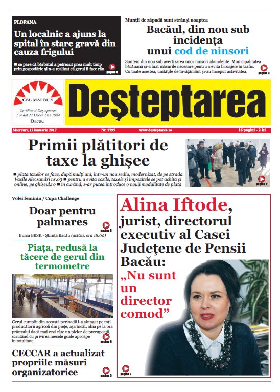 Pagina 1 Deșteptarea 11 ianuarie 2017 Acțiune FacebookTwitterWhatsAppTelegramVK Acțiune FacebookTwitterWhatsAppTelegramVK Muzica Militară a Garnizoanei Bacău aduce colindul la Spitalul Județean de Urgență Promoții cu gust autentic românesc 16-23 Decembrie „Școala altfel”, alături de polițiști: Concurs de kendama, antidot al bullyingului și alternativă de fair-play și camaraderie Efectele digitalizării raportărilor fiscale se lasă așteptate – TVA neîncasată, din nou în creștere Drumul Expres Bacău–Piatra Neamț face un pas decisiv: constructor desemnat pentru proiectul așteptat de ani de zile Șah: Cupa de Crăciun a ajuns la ediția cu numărul șapte Incendiu la un apartament în Bacău Braconaj la Itești: mistreț împușcat ilegal Ultima apariție a ziarului „Steagul roșu” – 16 decembrie 1989 Reges-Online devine obligatoriu de la 1 ianuarie 2026. Ultimele zile pentru migrarea din Revisal Gala Performanței Sportive: gratitudine pentru 2025, motivație pentru 2026 Gala Educației – 1.000 de laureați din Educația Băcăuană, recompensați pentru excelență