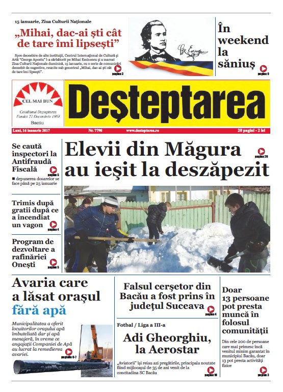 Pagina 1 Deșteptarea 15 ianuarie 2017 Acțiune FacebookTwitterWhatsAppTelegramVK Acțiune FacebookTwitterWhatsAppTelegramVK Zootehnia din județul Bacău, între ajustări și creșteri de eficiență Ministerul Sănătății vrea să introducă în rețelele publice apă nepotabilă? Handbal feminin/ Divizia A: Știința Bacău, învinsă de noua lideră, Sepsi Sfântu-Gheorghe Muzica Militară a Garnizoanei Bacău aduce colindul la Spitalul Județean de Urgență Promoții cu gust autentic românesc 16-23 Decembrie „Școala altfel”, alături de polițiști: Concurs de kendama, antidot al bullyingului și alternativă de fair-play și camaraderie Efectele digitalizării raportărilor fiscale se lasă așteptate – TVA neîncasată, din nou în creștere Drumul Expres Bacău–Piatra Neamț face un pas decisiv: constructor desemnat pentru proiectul așteptat de ani de zile Șah: Cupa de Crăciun a ajuns la ediția cu numărul șapte Incendiu la un apartament în Bacău Braconaj la Itești: mistreț împușcat ilegal Ultima apariție a ziarului „Steagul roșu” – 16 decembrie 1989