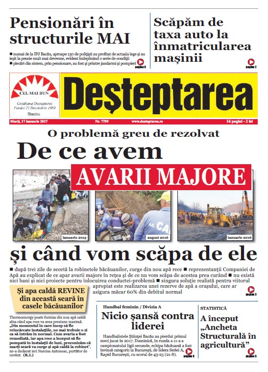 Pagina 1 Deșteptarea 16 ianuarie 2017 Acțiune FacebookTwitterWhatsAppTelegramVK Acțiune FacebookTwitterWhatsAppTelegramVK Hramul Sfintei Varvara și sinaxa preoților din Protopopiatul Onești, celebrate la 240 de metri adâncime în Salina Târgu Ocna Șezătoarea de la Măgura, o punte între generații și tradiții Percheziții și 12 autovehicule puse sub sechestru într-un dosar de evaziune fiscală de 150.000 de lei Jandarmii băcăuani au oferit daruri de Moș Nicolae unor copii din Stănișesti Gala Ecosistemului Antreprenorial al Universității «Vasile Alecsandri» Un mister din 1973… în Steagul roșu Fotbalul băcăuan la 360 de grade Depopularea continuă dar septembrie aduce o surpriză demografică Cum să ai grijă corect de parfumul tău Handbal juvenil: Prima ediție a Memorialului „Marcel Păunică” Polițiștii băcăuani, în sprijinul comunității: recomandări pentru sărbători în siguranță Intervenție laparoscopică reușită pentru tratarea infertilității cauzate de varicocel