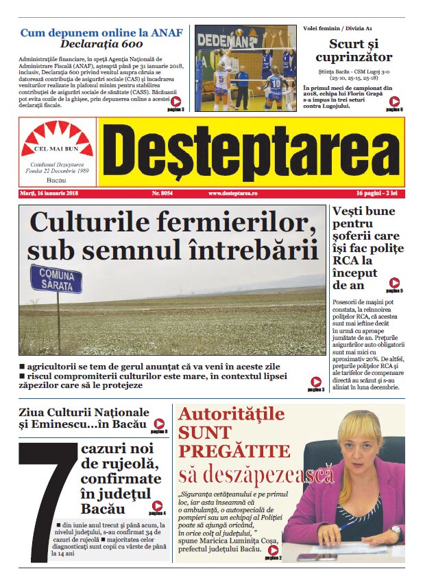 Pagina 1 Deșteptarea 16 ianuarie 2018 Acțiune FacebookTwitterWhatsAppTelegramVK Acțiune FacebookTwitterWhatsAppTelegramVK A7 Moldova: Lucrări avansate la trecerea Berești-Sascut, aproape de finalizare „Retorta de argint” și alte lumi dispărute: amintiri despre festivalurile muncitorești Bacăul accelerează în topul salarial al Moldovei: industria trage județul înainte Box: ACS Dan Gym Box, clubul de bronz cu oameni de aur Guvernul limitează cantitățile de alcool și tutun pentru uz personal: maximum 10 litri de băuturi spirtoase Scos din trafic de polițiștii rutieri și introdus în arest Exercițiu de evacuare și prim ajutor la Spitalul Județean de Urgență Bacău, simulând un cutremur în zona Vrancea Spitalul „Prof. Dr. Eduard Apetrei” Buhuși deschide dialogul cu pacienții, într-o întâlnire programată pe 23 decembrie Două dintre cele mai valoroase companii din România sunt din Bacău, conform Ziarului Financiar Bacău: Universitatea „Vasile Alecsandri” a organizat serbarea de Crăciun Dublă lansare de carte la Centrul de Cultură „George Apostu”, cu Carmen Mihalache și Dan Perșa Creștere a infecțiilor respiratorii în județul Bacău. Opt cazuri noi de gripă în ultima săptămână