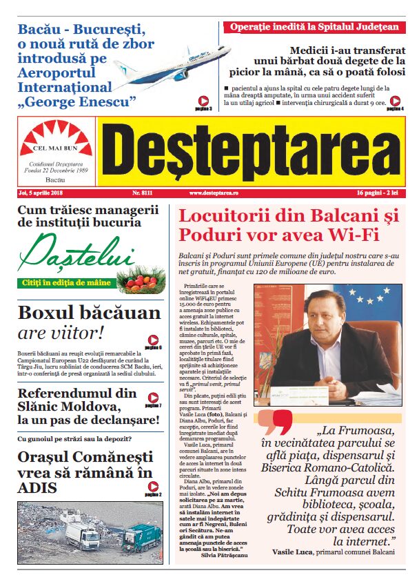 Pagina 1 Deșteptarea 5 aprilie 2018 Acțiune FacebookTwitterWhatsAppTelegramVK Acțiune FacebookTwitterWhatsAppTelegramVK Aurora Multimarket dă startul sezonului de iarnă cu reduceri de până la 90%! Fotbal/ Liga 2: FC Bacău o spulberă cu 5-1 pe Ceahlăul în deplasare și încheie anul în forță! A7 Moldova: Lucrări avansate la trecerea Berești-Sascut, aproape de finalizare „Retorta de argint” și alte lumi dispărute: amintiri despre festivalurile muncitorești Bacăul accelerează în topul salarial al Moldovei: industria trage județul înainte Box: ACS Dan Gym Box, clubul de bronz cu oameni de aur Guvernul limitează cantitățile de alcool și tutun pentru uz personal: maximum 10 litri de băuturi spirtoase Scos din trafic de polițiștii rutieri și introdus în arest Exercițiu de evacuare și prim ajutor la Spitalul Județean de Urgență Bacău, simulând un cutremur în zona Vrancea Spitalul „Prof. Dr. Eduard Apetrei” Buhuși deschide dialogul cu pacienții, într-o întâlnire programată pe 23 decembrie Două dintre cele mai valoroase companii din România sunt din Bacău, conform Ziarului Financiar Bacău: Universitatea „Vasile Alecsandri” a organizat serbarea de Crăciun