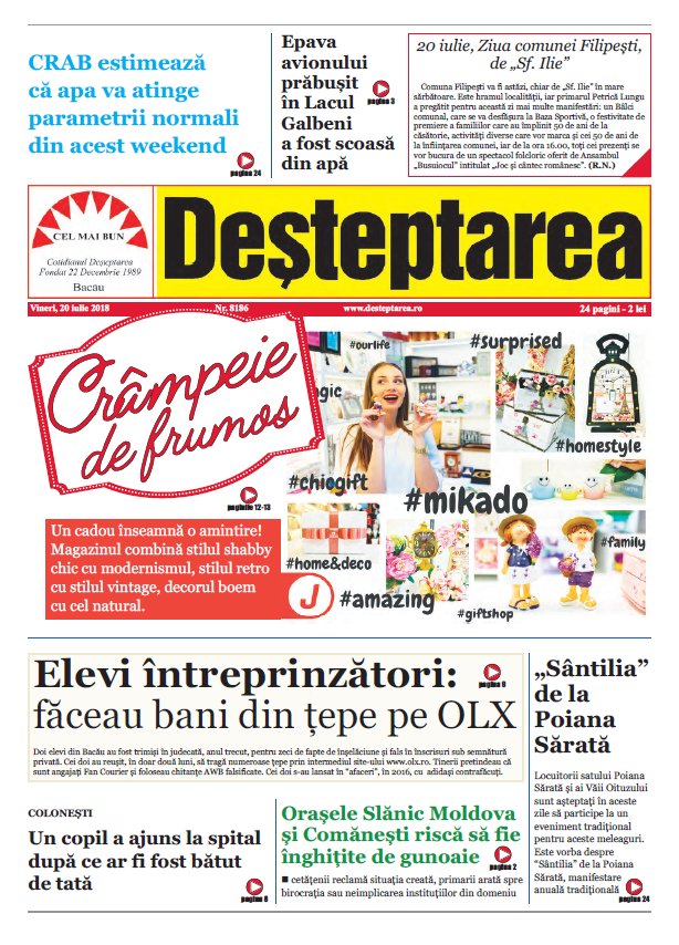 Pagina 1 Deșteptarea 20 iulie 2018 Acțiune FacebookTwitterWhatsAppTelegramVK Acțiune FacebookTwitterWhatsAppTelegramVK Șezătoarea de la Măgura, o punte între generații și tradiții Percheziții și 12 autovehicule puse sub sechestru într-un dosar de evaziune fiscală de 150.000 de lei Jandarmii băcăuani au oferit daruri de Moș Nicolae unor copii din Stănișesti Gala Ecosistemului Antreprenorial al Universității «Vasile Alecsandri» Un mister din 1973… în Steagul roșu Fotbalul băcăuan la 360 de grade Depopularea continuă dar septembrie aduce o surpriză demografică Cum să ai grijă corect de parfumul tău Handbal juvenil: Prima ediție a Memorialului „Marcel Păunică” Polițiștii băcăuani, în sprijinul comunității: recomandări pentru sărbători în siguranță Intervenție laparoscopică reușită pentru tratarea infertilității cauzate de varicocel 40 de kilograme de articole pirotehnice, deținute ilegal, descoperite de polițiștii băcăuani