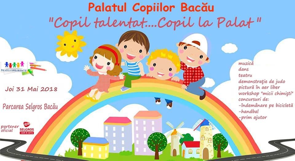 Pe 31 mai, între orele 10.00 – 18.00, Palatul Copiilor Bacău pune stăpânire pe parcarea Selgros și dă drumul distracției. Buna dispoziție este obligatorie și ne provoacă imaginația pentru că evenimentul are ca slogan “Copil talentat … Copil la Palat”. Selgros va asigura logistica, iar prezentatorul evenimentului va fi cel care are greaua misiune de a întreține buna dispoziție. Pe scena amplasată în parcarea Selgros vor urca copiii de la toate cercurile din cadrul Palatului.