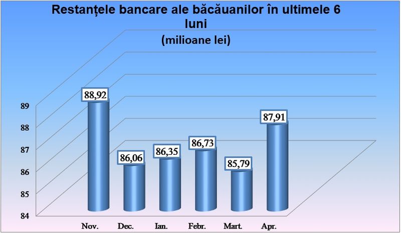 La finalul lunii aprilie, valoarea creditelor bancare a ajuns, în județul Bacău, la 4,32 de miliarde de lei, față de 4,35 de miliarde la finalul lunii martie. Restanțele au ajuns la aproape 88 de milioane de lei (cam ca în octombrie-noiembrie 2019), iar depozitele bancare la peste 13 miliarde de lei, față de 12,93 de milioane la sfârșit de martie.