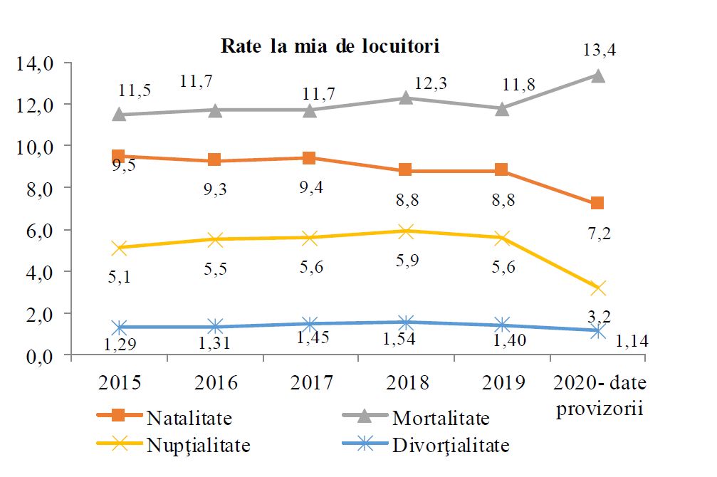 Un declin și mai însemnat a fost constatat în domeniul nupțialității, rata căsătoriilor scăzând cu 2,4 la mie (0,24 la sută), de la 5,6 la mie în 2019 la 3,2 la mie în 2020.