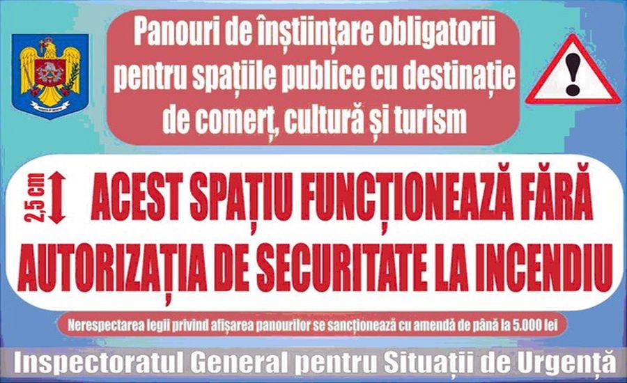 „Acest spațiu funcționează fără autorizația de securitate la incendiu” – acesta este textul care trebuie să fie înscris pe panouri cu litere de tipar de minimum 2,5 cm, de culoare roșie pe fundal alb.