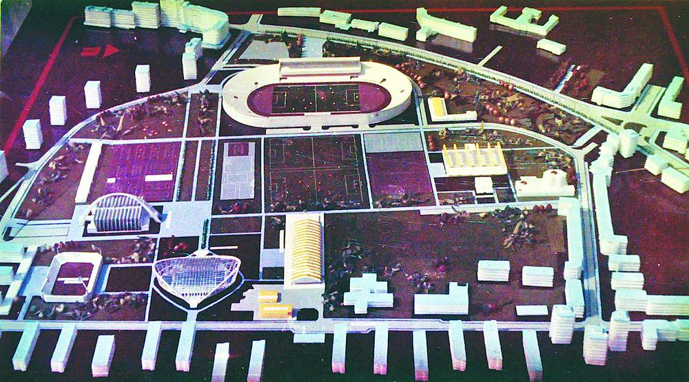 Erau prevăzute a fi construite: Sala de Sport, Sala de Atletism, Bazinul de Înot, Hotelul Olimpic, Sala pentru Sporturi Individuale (lupte și box), Patinoarul. Sala de Lupte venea pe locul unde este acum Universitatea Bacovia, iar Hotelul Sportiv, unde este Casa Albastră. Hotelul Sportiv era gândit să se înalțe din mijlocul unui bazin cu apă (ceva de inspirație japoneză), având în jur 3 pavilioane.