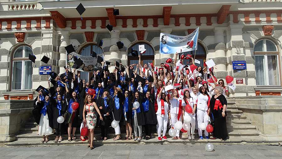A sosit și momentul în care absolvenții Școlii Postliceale Sanitare din cadrul Colegiului „Mihai Eminescu” Bacău să-și strige bucuria în stradă, odată cu terminarea studiilor. Astfel, cei 61 de absolvenți au defilat prin oraș, plecând din Parcul Trandafirilor, prin zona centrală a orașului, cu o staționare de câteva minute în fața Palatului Administrativ și o alta în fața Primăriei Municipului Bacău acolo unde au fost întâmpinați și salutați de primarul Cosmin Necula.